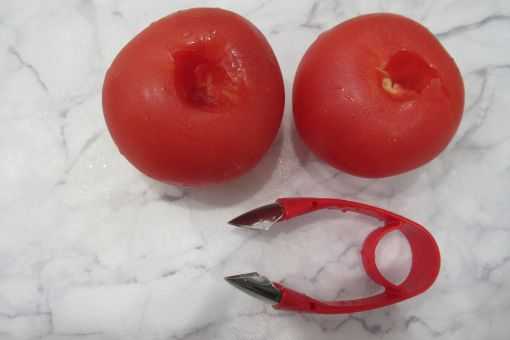 ​​そしたら見つけたんです、トマトの前にあるハサミのような形の物、画像のトマトのヘタもこれで取りました、綺麗に取れます、イチゴのヘタ取りは楽しくなります、歯の部分をヘタに指し込んで抜けばOK~~。