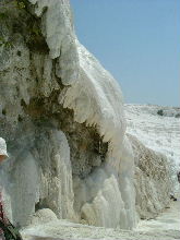 「...なまぬるく、熱くも冷たくもないので...口から吐き出そうとしている。」(啓示の書3章16節)と言われたラオデキア会衆。もちろん行いに対して言われた言葉ですが、この表現になったのもなるほどな、と思わせる場所にあります。パムッカレの石灰棚を作る要因になった温泉は、源泉でも40度を越す程度なのです。パムッカレの石灰棚を流れるお湯は熱くも冷たくもない、生ぬるいものです。 実は、聖書時代のラオデキアの遺跡はデニズリ市街から6キロほど行った所にある丘の上にあります。現在も発掘が続けられています。上の写真は、パムッカレの石灰棚の上にあるヒエラポリスの遺跡です。これは少し時代の下がった、リキア時代の遺跡です。