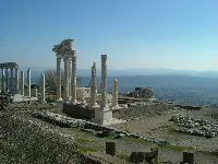 1世紀のペルガモンは、トルコ西部のベルガマ市にあります。現在トルコ第三の都市、イズミル(1世紀のスミルナがあった所)から車で一時間ほど、小高い山に挟まれた山間の街です。地の利を活かして古代の町は、見晴らしの良い丘の上に造られており、アクロポリスからは現在のベルガマ市が見晴らせます。山の傾斜に合わせてか、ここの古代劇場の傾斜はとても急で、高所恐怖症の私など、どんなに素晴らしい演劇でもここに座ったら下の舞台を眺められないだろうと思うほどです。 市の西側にはアスクレピオンの遺跡もあり、サナトリウムというか病院というか...の遺跡が残っています。写真では夕景で何も見えませんが。