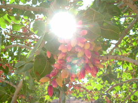 これ、なーんだ?ヒント!・・・はやっ9月頃に南東部、特にガジアンテプ( Gaziantep )の辺りでこんな風に木に生っているのが見られる。 ピンポーン! 正解!ピスタチオ。トルコ語では、フストゥク( fιstιk ) という。人を指して、フストゥク ギビ(fιstιk gibi)--という風に使うこともある。本来は、溌剌とした、とか、可愛い、とか、美しい、とか良い意味で使われる。Sen fιstιk gibisin.-君はピスタチオみたいだね。と言われたら、・・・とりあえず怒るのは止めておきましょう。皮をむいて、そのまま食べても美味しいピスタチオ。トルコでは、色々なお料理にも使われている。ピスタチオの産地で有名なアンテプは、バクラヴァ( baklava )-トルコ風というか、アラブ風パイのシロップがけという感じのお菓子-でも有名。ふんだんにピスタチオを使ったバクラヴァは、なるほど、おいしい。生地がパイ生地ではなくて、糸状になっているカダイフ( kadayιf )もあるし、形状や中身にもいろいろなバリエーションがある。ピスタチオも、まるまま中に詰めたり、砕いて上にふりかけたり、パイ生地の間に挟んだり... カトメル( Katmer ) ブルマ( Burma ) ピスタチオケバブ(fιstιklι kebabι)お菓子は、ああ、ピスタチオ入りだな、と一目でわかるほどピスタチオが入っていると、割と、甘さ控えめでおいしい。当然だが、ケバブは、甘くない。ナッツ入りの料理?!と、最初は意外に思ったけれど、トルコ料理では、胡桃とか松の実とかのナッツをよく使う。ピスタチオ入りのケバブも、美味。私がよくお土産にするのが、ピスタチオ入りのチョコ。ウルケル( Ülker )というメーカーの Eceは、ピスタチオが一粒ずつ入っている一口サイズのチョコ。ヘーゼルナッツ入りのもある。最近、板チョコタイプのものも出た。