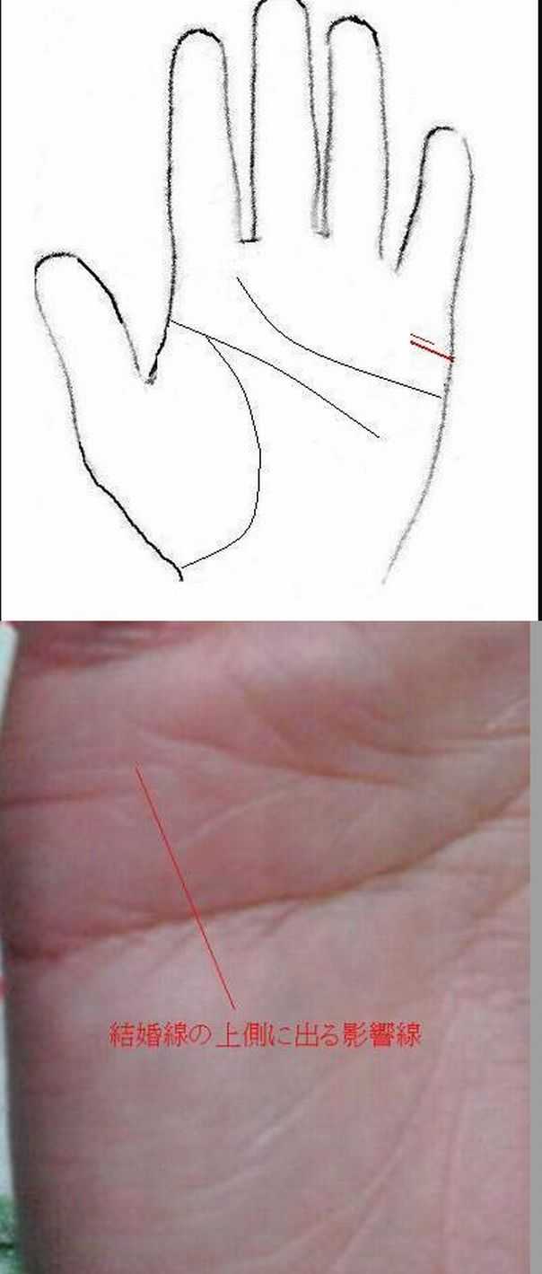 ■□□================================================□■ 手相講義☆実相偏・・・結婚線☆結婚線の先端、上側に短い線が平行する相115□===================================================結婚線から何がわかる・・!?結婚線の先端、上側に短い線が平行する相 115結婚線の上側に沿うような形で現れるやや結婚線より薄めの短い線は、結婚後に愛人や不倫相手の出現を示しており、近い将来または現在進行中であることを示しています。イラストと手相写真を見ながらイメージを掴んでくださいね。占いブログ次回は、結婚線の先端、下側に短い線が平行する相 116です。お楽しみに!!