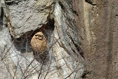 今日は、オオワシ遠征に行く予定でしたが折からの寒波!!朝起きると、周りは真っ白。家は、スタッドレスはいてますが雪に弱いこの近辺、ノーマルタイヤの車があちこちで立ち往生。もらい事故もいやだし、渋滞もすごかったのであきらめて帰りました。その後、近くの川にカワセミに行き、カワセミ撮ってると通りがかりのバードウォッチングの方にハヤブサ情報をもらいそっちに移動しました。ハヤブサ地点に着いたとたん、上空をハヤブサが舞って、上昇気流に乗って旋回を始めました。あわてて、三脚たててカメラ出したが間に合わず、結局それっきりでした。ハヤブサが来る崖に不気味なスズメバチの巣がありました。