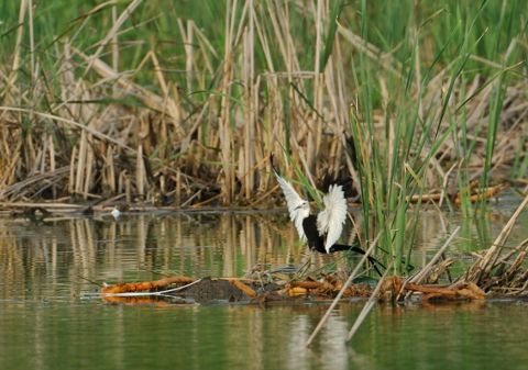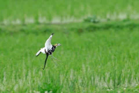 先日のレンカクの続きです。レンカクは、蓮の葉の上などを歩けるように足の指がとても長くて重量を分散する等と図鑑に書かれています。写した写真をよく見ると、足は太くてごついですが指は本当に長い。2枚目は着地時。 チョットピントが甘いですが、長い足の指を大きく開いてるのが確認できると思います。この場合は田圃ですが、直接蓮の葉などに着地??しても大丈夫なんでしょうね。鳴き声も特徴的、子猫のように「みゃおー」なんて書かれています。写真は、機能アップしたのと同じですが これくらい間近で飛んでくれたときに、かすかに「みゃおー」が聞こえました。確かに、「みゃおー」って子猫のような声が小さく聞こえました。ケリくらい大声で鳴いてくれると分かり易いのですが、体の大きさに比べるととても控えめな声なんで、気づいた人はほとんど居なかったかもしれません。小さくて、か細い「みゃおー」でした。