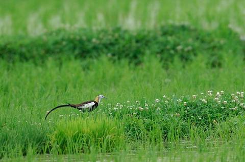 今日は、午後からの鳥見。レンカク、まだ居てくれました。数日ですが田圃の稲も伸びてきて、ダイブ見にくくなってます。13時過ぎに到着、先に来てた人に話を聞くと、今日は朝から2回しか飛んでいないとのこと。稲が伸びて、視線を遮れるのか池の葦の中に入らずに田圃で休憩してるみたいです。そこから2時間程の待ち時間、やっと飛んでくれました。 池の上を飛行してから、いつもの葦の中へ。急に飛んだ原因はオオタカでした。飛来したオオタカは、カラスに追われてすぐにどこかへ。 伸びた稲で人目は避けれても、上空からの視線は避けれないみたいです。オオタカの後は、ハチクマも来てサービスしてくれました。 レンカクは、空からの攻撃をおそれてかしばらく葦に身を隠してました。しばらく身を隠した後は、待望の池の近くの田圃に入ってくれました。 3回目のレンカクさんで、一番近い距離です。やっぱり近くは良いですね。今日は、久し振りにメモリー残量を気にするくらい撮っちゃいました。RAWで496枚です(^_^;)。