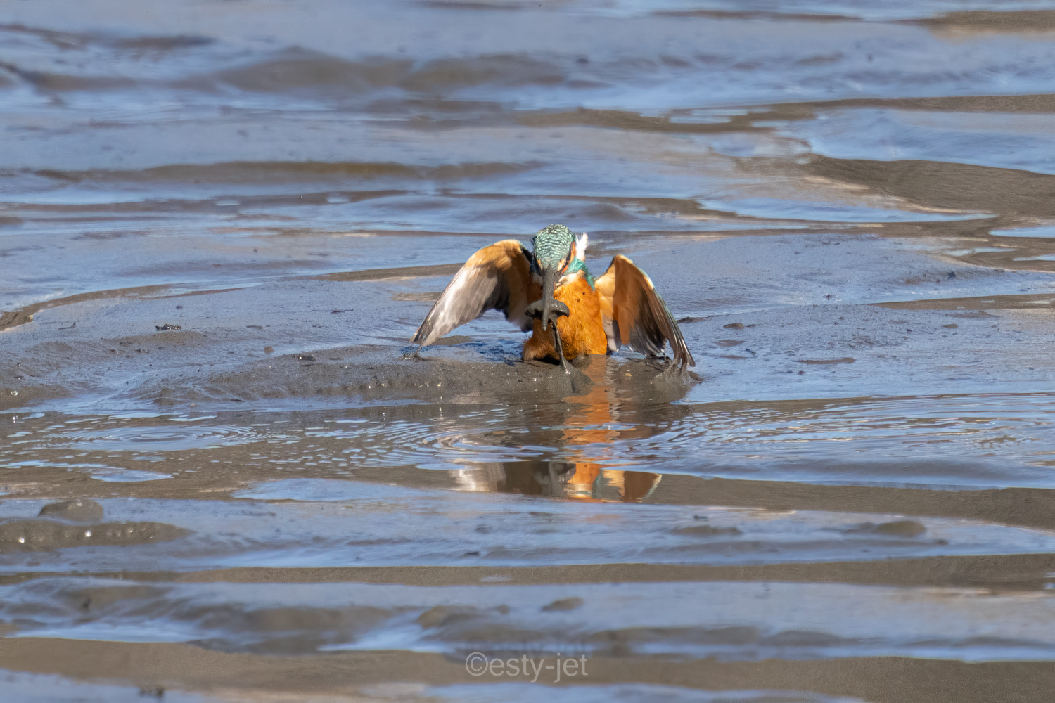 こんなに続けて投稿するのは何年振りかな。昨日紹介した尾羽欠損個体が、今日は泥にダイブでした。
