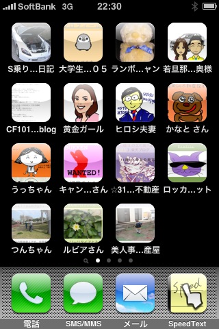 今夜は はやくもウトウトしてます。。 なので(?!) ちょっとした小ネタだけをUPします! これは マイ iphoneの 第一画面です!各ブロガーさんのショートカットを載せてます! ここに 載りきらない方は 第二~以降の画面に入ってます! さて、 このショートカットですが 各イラストをタッチすると 勿論、その方のブログが開きます! が。。。 タッチすると プロフィール画像のズームアップ状態から始まるんです! ですので プロフィール画面から ブログ画面へと進む(戻る?)必要があります! ズバリのショートカットにはなってませんが そんな無駄も楽しいです! これが 遊び心ってやつでしょうか? オヤスミナサイ! ★皆さん、昨晩の記事へは 多くのお声をありがとうございました! <(_ _)>是非参考にさせて頂きます!