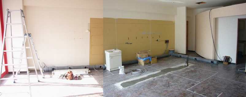 水道工事、電気工事が完了したそうです。 (画像は左右計2枚を連結合成しました。)思っていた以上に多くのパーツを使っていたので 少々勿体ないと思いましたが・・・ 家族に任せた後に更に業者が入ると 伝言ゲームのようで ちょっとした事が伝わっていないことなど 発生します。。 私が「ここはA案で決定」と決めていても 親「A案かB案、選択は業者に任せた」 みたいなこと! そして結果過剰部材投入。。。 う~ん、話した意味がない。。。 (;゚Д゚)! まあ・・さておき 本日は水道工事が完了したあたりに 少し立ち寄れたので もう少し撮影してきました。 まだこの時点では 天上の電灯位置は付け変えが終わっていなかったです。 (鏡の下にある配線付の物は各マシーンと繋がる個々のブレーカー!) 次の画像は 店舗中央の床に飛び出ていた 水道パイプと給湯器からのパイプを マシーンの裏まで引っ張り直した図! これは床を5センチ掘るだけでよかったので我が家でやりました 楽でした! 後は店舗に無関係な床シートを剥がしてきて ここに貼ればOK! 明日のブログでは 折込チラシについて 配布部数や単価等が分かったので その辺りを お伝えしたいと思います。 該当エリアでの配達先部数も把握できました。(´∀`*) あああ!汗 従姉妹に メールしなくては。。 チラシの原稿データ 従姉妹に作って貰う予定です。 従姉妹は あの「婦人公論」などのイラストも手掛けています! チラシもウマいんです! (”佐々ショウジン”で毎週月曜に配信中!)