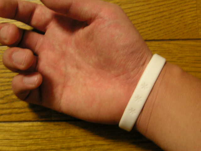 この間、オークションでいろいろ見ている時、このバンドの存在を知りました。すでにご存知の方も多いかもしれませんが、「ほっとけない 世界のまずしさ」キャンペーンのホワイトバンドです。あのミスチル桜井さんも参加しているようです。そういえばミスチルのホームページにそんなこと書いてあったような・・・。コンビにではファミリーマートしか置いていないということで、自宅近くのファミマに出かけてみると、もう売り切れたとのこと。店員さんが言うには、若い人がいくつも買っていく人気商品だそうです。今後の入荷予定もなく、手に入れるには、他のファミマを回ってそこに残っていることを期待するしかないといわれました。仕方がないので、いったん家に戻り、近場にあるいくつかのファミマに電話をかけて、まだ残っているかを確認しました。(←やりすぎ!?)そうすると、なんと残っているところがありました!さっそく、出かけていって購入しました。ひとつ300円です。写真からもなんとかわかるかと思いますが、3つの*(アスタリスク)が描かれています。これにももちろん意味があります。もし興味があればホームページ見てください。生活:7点勉強:8点運動:なし