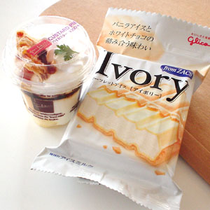 年初から歯の治療を再開したが、2月末に歯を折ってしまってから、歯がなくなった所に一時的な「仮歯」を入れている。あくまで「仮歯」なので、細部の細工は大味でまるでゴツゴツした石膏の固まりみたいな異物をいつも口に入れてる感じ。それでもだんだんと感覚的には慣れてきてるけど、今に至るまで、依然として「仮歯」生活。で、たぶんそのせいだと思うんだけど、歯の治療を始めてからというもの、ずーっと、やたらとアイスが食べたい。中でも特に「仮歯生活」になってから。外出した時に歩いていてコンビニを見つけたら、必ずアイスを買うことを続けていた。機会にさえ恵まれれば、毎日1~2コづつのペースで食べちゃう始末。このところふせってた間は食べれなかったが、また異常な「アイス食欲」が再びわき上がってきた。固いものをガンガン噛んだり出来ないし、異物が口の中を占領してる感じだし、必ずいつもどっか一部が痛むし・・・っていう感じで、治療中の今の口の中は、超・ストレス状態。それを、アイスのさわやか感でうさ晴らししているとしか思えない。だから無理にやめようとも思わない。食べちゃえ、食べちゃえ!大体いつもチョコのアイスがほとんど。写真はグリコの、ホワイトチョコのアイス(と、ついでに買っちゃったデザート)。試しにホワイトチョコのを買ってみたけど、うーん、やっぱり普通の黒いチョコの方が好みみたい。アイスじゃない普通のホワイトチョコは大好きだけど、このアイス、あんまりホワイトチョコ独特の味がしなかったような・・ちょっと気になる「まゆたま」→ 「グリコ」「アイスクリーム」で商品検索