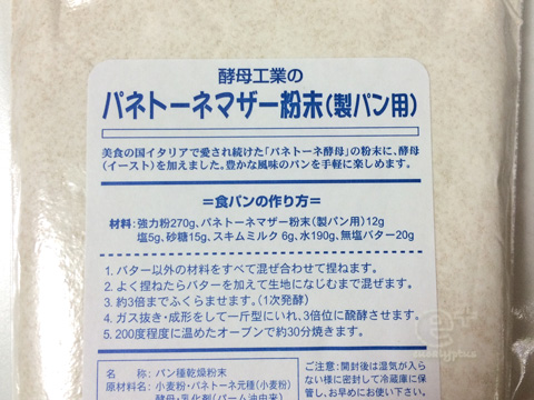 先日急ぎ注文した、パネトーネマザー。メール便で今日届いた。このパネトーネマザーのパッケージ記載のレシピに近い形で一度パンを焼いてみようかな。*パッケージ記載内容* MEMO=食パンの作り方=強力粉270g、パネトーネマザー粉末12g、塩5g、砂糖15g、スキムミルク6g、水190g、無塩バター20g