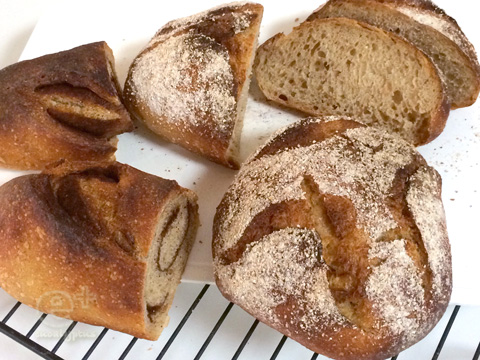 昨日作った元種で、さっそく久しぶりの自家製天然酵母パン焼きへ!ひさびさのハード系パンだよ〜♪■自家製梅シロップ酵母 元種で ライ麦パン2種(成型時に2種類にして焼成)(ホームベーカリー & ヘルシオ / キタノカオリ / 自家製梅シロップ酵母のライ麦種)(date 140807 )・自家製梅シロップ酵母のライ麦種 160g・水 145g(140gでこね始め、様子見て+5g)・発酵しちゃってる梅シロップ液 大さじ1・三温糖 5g(梅シロップ液が甘いので、ここで少し減らすことに)・塩 7g・強力粉( 富澤商店キタノカオリ )320g・無糖ココア粉末*MEMO*(基本的に、上から順にパンケースへ)(HBはMKホームベーカリーHBH916使用)---ホームベーカリーのパンケースに元種と水を入れてヘラで両者をなじませる---糖分と塩を入れて混ぜる---粉を入れ、HBで食パンコース/1.5斤/焼き色ふつうスタート(12:55ぐらい-)---2度目のこね開始8分経過時に手動でスイッチオフ、パンケースを取り出す---生地をパンケースから取り出しタッパーに入れる---室温で一次発酵(13:55ぐらい-)---約2倍以上になり一次発酵終了(21:00ごろ-); 約7時間の一次発酵(完全に過発酵) (左=一次発酵開始時 右=一次発酵終了時) ---タッパーから生地を出し丸め直してベンチタイム30分---成形。3分割---1つに無糖ココア粉末を巻き込み細長く、あとの2つを三角に成形---二次発酵:ヘルシオ 手動加熱 >煮込み発酵 >発酵 >35度 >100分(様子を見ながら)(二次発酵前)---ヘルシオに天板をひっくり返して1枚入れる---ヘルシオ 自動メニュー-お菓子パン-フランスパン(焼き上がり:薄め) 余熱 スタート---余熱が終わるころに生地表面に霧吹き・打ち粉(ライ麦中挽)・切り込み---余熱完了、庫内で熱していた天板(裏面)上に急いで生地を乗せ代える---焼きスタート→お任せで焼き上がり (左=焼く直前 右=焼き上がり) ヘルシオの自動メニュー「フランスパン」を利用したら、焼きすぎになっちゃった!焼き上がり「うすめ」を選択したんだけど・・。次からは自動メニューは使うまい!でも、本当に久しぶりの自家製天然酵母パン。やっぱりいいなあ。また焼くぞー!