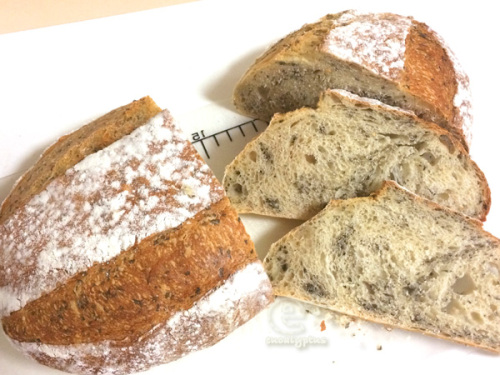 前回、前々回と失敗続きでメゲそうだったけど、・オーブンのこげに注意して(前々回の教訓)・ちょっとライ麦粉を使うのやめて(前回からの教訓)そして、新たな試み、・プラスチック製「なんちゃって発酵かご」に 「布どり」を組み合わせた二次発酵方式で、焼いてみた!ひさびさの、成功〜! ホッ!!!■ホシノでバジル入りハードブレッド(date 150611 12:55- )・水 240g・三温糖24g・塩 6g・ホシノビール酵母パン種 を 起こしたもの 32g・強力粉(572310.comの北海道産ハードブレッド専用粉エペ)400g(基本的に、上から順にパンケースへ)& 乾燥バジル 大さじ4(HBはMKホームベーカリーHBH916使用)--- ホームベーカリーのパンケースに材料を入れ、食パンコース/1.5斤/焼き色ふつう スタート(12:55-)--- 2度目のこね開始6分で強制終了。またしても生地の水分が多すぎてゆるゆるなので、緊急措置として、パンケースから取り出した生地に乾燥バジルを手でおおざっぱに混ぜ込み(水分を吸ってもらうように!)--- タッパーに入れ一次発酵開始--- 約5時間半後、3倍近くになり(なってしまい)一次発酵終了 → --- まるめなおしてベンチタイム40分--- 成形して二次発酵なんちゃって発酵かごに布どりを組み合わせ。←NEW!ライ麦粉粗挽きを振り、生地を入れてヘルシオ30度で30分 二次発酵 → 焼く直前。だるだる〜ん--- 焼き190度で30分元気な焼き上がり!後から水分調整のために加えた乾燥バジルのおかげで、どうにか扱えるギリギリの状態になった。(それでもやわらかめ・・・。 このレシピって、そんなに水分多めだったっけ‥? 今度からこのレシピの時には、水分量思い切って15ccぐらい減らしてみよう!)バジルが均一にまざってないのは、ご愛嬌。そして今回初挑戦、「なんちゃって発酵かご+布取り」。うまく行った〜! よかった!!型に生地がくっつくことなく、するりと出てくれた。方法は、発酵かごの長辺にパンマットがかかるように布を置く。そこに、閉じ目が上になるように生地を置く。(布は、長辺に合わせて折って幅を調整.)今度もこの方法で行こう。発酵かごに、布どりを組み合わせたって、いいじゃない!布どりする場所が、平面じゃなくたって、いいじゃない!・・・といったところかな。しかしその生地が、余熱を待つ間にみるみるうちにダレて行く‥。二次発酵が終わってオーブンの庫内から生地を出したあと、余熱を待つ間に、うっかり早めに発酵かごから生地を出してしまったものだから!(もともと生地がやわらかめなこともあって)余熱完了直前に発酵かごから生地を取り出すこと! これ大事!