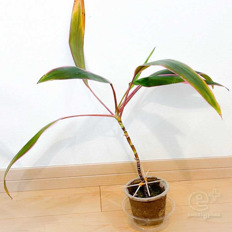 *これまでのいきさつ 取り木のための仕掛けを付ける(blog 2024/07/04) 発根を確認、切り離す(blog 2025/04/28)コルジリネの取り木の、現在の状況について。4月に切り離した その木も、取り木元のほうの木も、どちらも元気に過ごしている!まずは切り離した方の木。無事に根を張って独り立ちできたと見ていいだろう。スクスクと新しい葉っぱを伸ばしてきている。取り木「もと」の、本体は、こちらこれは枯れたりする心配はあまりなかったけど切断した下側から新芽が出てきてくれているのがうれしい点。アップ!矢印の先、こんなに元気よくニョキーっと!欲を言えば、もうひとつぐらい新しい芽が出てきてほしいところだけど。(1本の木が二又になるようなイメージ.)まあでもゼータクは言わない(笑)というわけで元々1つだった木、無事に取り木で増やせたということで。今回の取り木プロジェクト、成功ー パチパチパチ今度はこれらを1つの鉢にまとめて寄せ植えにしたい考え。時期を見て、やらなきゃ!(今年4月の、切り離す前の1本状態)↓本日、2鉢 横並びにて