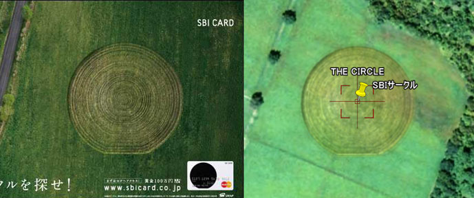 Google Earthで謎のサークルを探せ!!ってゆうSBIの企画。発想は面白くてすごく楽しめたけどMISSIONいらねえよヒント無しで世界中探しまくって本当に見つけたやつにこそ100万円やるべきだな。だって最後簡単に見つかりすぎだもん。そして電車の中吊り広告との違いに吹いた。ぜんぜん違う所だろ!音楽がすごく良かった気がした。暇ならやってみるといい。http://www.sbicard.co.jp/