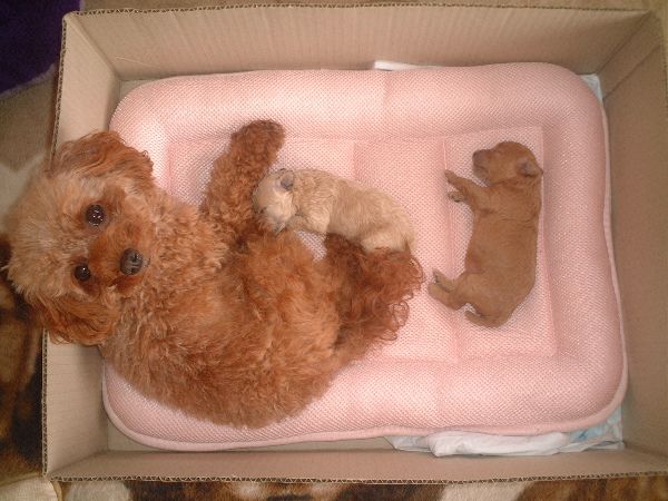 みなさんネギの出産にお祝いのお言葉を有難う御座いましたm(⌒0 ⌒)m毎日nene(男の子)とnana(女の子)を飽きずに見ていて画像もいっぱい撮ってるのにゆっくりPC向かう時間がなくて更新出来なくて遊びに行けなかったり読み逃げだったりお返事も遅くなってしまってすみませんm(- _ -)mネギは、しっかりママしていてちょっと乱暴な時もありますが元気で体重も2.2キロだったのに一番お腹が大きい時は、3キロになって抱きにくかったですが出産してすぐ2.2キロに戻りました!neneは、生れた時120グラムでしたがすくすく育って今朝は、142グラムになりました^^nanaも生れた時は、132グラムが166グラムに増えてます^^ダックスと違ってプードルは、断尾があり明日neneとnanaの断尾と狼爪カットに行ってきます。初めての事でどうなるかドキドキです!ネギも出産後ウ○チが少し緩いのでついでに爪きりなどしてもらって診てもらいます。記念じゃないけど今朝撮ったばかりのneneとnanaのカット前の尻尾です^^目が見えなくて耳のまだしっかり開いてないのによく動くしよく鳴くしおっぱいもいっぱい飲んで良く寝て元気な可愛い子達です♪私の方は、親ばかして毎日飽きずに見てばかりで何も出来ずに困った飼い主です(>o