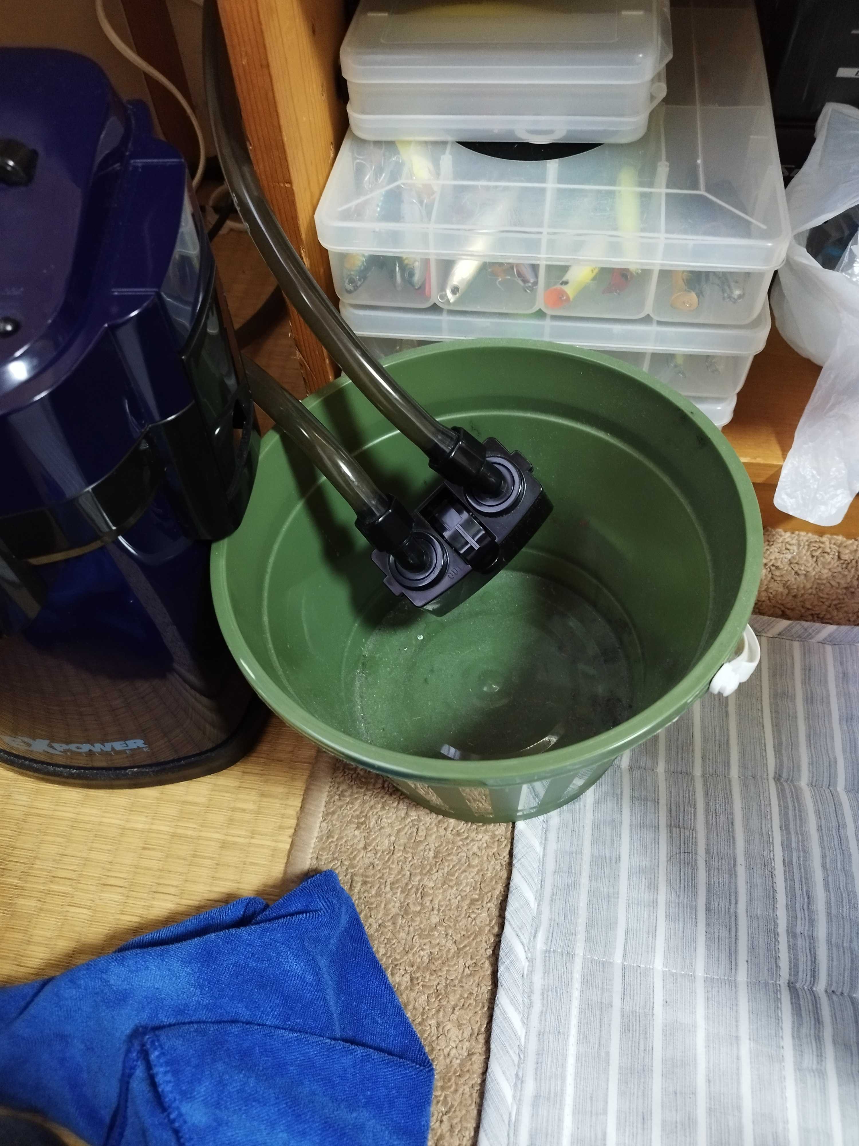 黒いモヤモヤがいっぱいです。こちらはリング濾材を敷き詰めてます。こちらもバスケットのまま、飼育水を入れたバケツにドボンです。