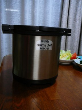 わが家は良くこれを使って調理いたします。ご存知の方も多いと思いますが。シャトルシェフ(思い切り商品名!?)でございます。煮豆やポトフ、カレーなどがとても美味しくできます。ずぼらな私の大のお気に入りです。一時期圧力鍋で頑張ったこともありましたが、どうも苦手で・・・あのシュッシュッいいながら、回る栓の調節がめんどくさいし・・もしかして、爆発したらどうしようなどと要らぬ心配をしながら鍋に張り付いて見ているために圧力鍋を使った後は、どっと疲れてしまっていたのです。でもこれは、煮立たせた後、そのまま放置。(火は付いていません。省エネでしょ?)外出したまま、安全に調理加熱中。時間はかかりますが、圧力鍋と同じように出来上がります。今日のメニューはこちらビーフシチューです。固いスジ肉が、箸で簡単に切れるくらいやわらかく出来上がりました。安いお肉も、最高級のお肉のような柔らかさ・・・朝出かける前に、野菜・肉を煮立たせて専用の外鍋に入れておきます。夕方帰ってくるころには、やわらか~~く煮崩れもなく煮あがっています。ルーを溶かして出来上がり。あと、夏のキャンプのときにも仕込んで行くと向こうで子供と一緒に目一杯遊んでも、夕食の心配はなしです。最近これより一回り小さいものや色のかわいいものも出ているみたい・・・私はオレンジ色のが欲しいと思っています。★シャトルシェフ 気になる方はこちら★