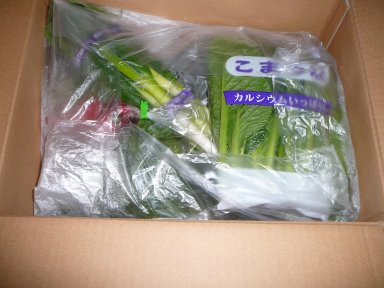 ははは・・・・また頼んでしまいました。すっかりお取り寄せにはまってしまっています。何箇所か検討し、今回頼んだのはこちら。送料無料!!生活応援 新鮮お野菜つめあわせ便送料込みの2100円。42センチ×31センチ×25センチの箱を開けると箱、結構大きいのにダンボール満タンのお野菜が・・・・床に並べてみました。左上から、長ネギ7本、小松菜、ほうれん草(最初見たときはターサイだと思いました)大きなカブ3個、アカピーマン、大根(ちょっと細め)、真ん中の段、きゅうり、ブロッコリー、にんじん、下の段、キャベツとレタス。合計11種類のお野菜でした。今とってもお高い、レタスやきゅうりが入っていて嬉しかったです。まぁ、計算してみると高くもなく安くもなく、といったところでしょうか。・・・ところがです!!このお野菜たち、只者ではない様なのです。うまく表現できませんが、パンパンに水を含んでいる手触り、とでもいうのでしょうか。手触りがパリパリ・・・う~~ん、語彙が少なくてすみません。とにかく、重くて張りがあります。届いたら、すぐに使ってみたくなる私・・・昨日の献立で、白髪ねぎと、レバーと一緒に煮たのは、このセットの長ネギでした。このネギ。切る時「ぎゃぎぎゃぎ」いいます。焦りました・・・これは硬いネギなのか・・・?!とんでもない。火が入った瞬間に、フワトロに・・・生で食べても甘いっ!!おかげで、昨日のレバーの甘露煮、とってもおいしかったです。次、驚いたのがホーレンソーです。こいつは何者????ビニール袋の外から見た時京野菜のターサイかと思いました。ハイ。念のため申し上げますが・・・写真はたった一束でございます。ボールの大きさは直径28センチはあります。こいつが2束入っておりました。手触りはビロードのようです。デカサもさることながら、葉の断面を見てびっくりしました。1ミリ近い厚さです!!こんなに厚いほうれん草見たこと有りません!!!意外にも、熱湯に入れたら一瞬でやわらかくなって、あわてて水にとりました。なんというのでしょうか。野菜君たち、すごい元気です。魚じゃないのに、ぴんぴんしております。今日の献立です。親子丼ほうれん草のおひたし味噌汁今日は仕事で帰りが遅くなるのが分かっていたため、子供たちに親子丼を頼みましたが・・・もうちょっと、卵半熟でお願いしたかったです。(ちょっと残念、やってもらって文句言う訳にもいきませんが。)ほうれん草のおひたしは、おひたしとキムチ少々を韓国のりでくるっとまき、醤油少々つけていただくのが、わが家のブームです。よろしかったらお試しくださいませ。土曜日には、また魚えーセットが来ます。頑張って冷蔵庫の中の食材消費します・・・