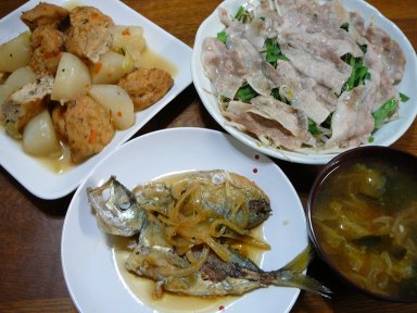 冷蔵庫の中に魚がいません。禁断症状のようです。土曜日に良い評判の《いさり火セット》が届くので(楽しみです)インターネットでポチッとやるのをこらえております。今日の買い物はスーパーで。鯵4尾298円なり。これで南蛮漬けにトライです。すっぱいのがあまり得意ではないので、少したれを煮て酸味をとばしました。今日はそのほかに、ガンモとカブのやわらか煮モヤシと韮、豚バラ肉の蒸し物味噌汁でした。今日は「モヤシ・・・蒸し物」のレシピを。1.モヤシ(1袋)洗う2.韮(1把)を洗い、適当な大きさに切る3.豚バラ肉(200gもあれば十分)を10センチくらいの長さに切る4.お皿の上にもやしと韮を載せ、豚バラ肉で周りを覆う。5.ふんわりとラップし、電子レンジで肉に火が通るまでチンする6.たれをかけて食べる。 (たれ・・ポン酢(カップ4分の1)、カレー粉(大1)、ごま油(大1)をよく混ぜる)これが超簡単レシピなのにおいしいのです。韮が苦手な子供もこれなら食べてくれます。皆様もよろしかったらお試しください。