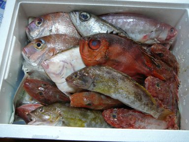 夕方6時になってやっと届いた「いさり火セット」待っていました!!箱を開けるのドキドキ・・・うう~ん、一杯入っているけど、前回よりは小ぶりかな・・いやいや、前回が(1月13日)良すぎたから、ま、こんなもんでしょ。うんうん。あらら、マダ隠れてる魚君がいました。下のほうにヨロイイタチウオ、5尾です。それと、左上からチカメキントキ、クロガシラカレイ、黒ムツ、アイナメ2尾期待していたチカメは残念ながら、ベビーサイズ。でもカレイが大きいからOK.最後に左上から天然真鯛2尾、フサカサゴ7尾、ホウボウ2尾、カナガシラやった~。今回も目一杯詰め込んでいただきました。本当にありがとうございます。本田おさかなShopさん。届いたのが遅かったので夕食にはヨロイイタチウオ1尾とカナガシラをお刺身にいたしました。奥がカナガシラ手前がヨロイイタチウオです。意外にもこのヨロイイタチウオ、顔に似合わず、美しいピンク色の身でこりこりの歯ごたえです。人も魚も見た目で判断してはいけないのね~~。反省・・・夕食後、それぞれの魚を下ごしらえしながらつまみ食いです。カレイに立派な白子のおまけつき!!さっと煮て小口ねぎでいただきます。明日のお刺身用にアイナメをおろしひいた皮を竹串に巻きつけました。塩を振って焼いただけです。う~~ん、絶品。週の初めから、夜更かししてしまいました。今週1週間、辛いかもしれない。