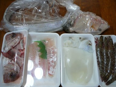 こんばんは。訪問ありがとうございます。本日またまた山口県産海鮮広場 魚かつさんのセットが届きました。相変わらず、ここのセットは素敵です!!小魚宝箱魚えーっセット パート2小魚とお刺身用のお魚2品箱を開けるとこんな感じ・・・メダイ(1キロ超)、マダコ・・・お刺身用太刀魚、ヨロイタチウオ、レンコダイ、アマダイ、カサゴ2尾、ホウボウ、ワタリガニ、ウチワ海老、、サザエ、イイダコ8杯という内容でした。今回も大満足です!!着いてすぐ(朝9時半に)朝ごはん食べたばかりなのに、サザエ、ウチワ海老、ワタリガニを蒸していただいてしまいました。ウチワ海老初体験です。魚かつさんのメルマガで、とっても気になっていたのです。う~~~ん!!おいしいっっ!!どうしようかな、追加で頼んじゃおうかな、うちわ海老・・・(あぶない・・あぶない・・でも止まらないかも・・)蒸したときに皿に出た蟹・海老・貝のうまみがたっぷり出たスープでもう一品・・おまけ。出し巻き卵です。ホワホワで、うまみがたっぷり。文句なしでおいしいっ!メダイとタチウオです。今日のお刺身にメダイつかってみようと思います。イイダコ君達はぬめりを取って、頭の中をきれいにして保存。左からホウボウ、カサゴ、レンコダイ、アマダイ、ヨロイタチウオそして本日の大目玉!!大きなマダコ君ですこのサイズのマダコ(生)なんて、目にしたのは何年振りでしょうか。足1本、特に太そうなのを選んで、切り落としお刺身にします。それ以外はゆでてみました。そして今晩のおかずは・・マダコ3種盛り(生・茹でスライス・ブツ)生タコ、うまいッ!!です。こりこり吸盤が特に・・あぁ、1本だけじゃなく2-3本しておくんだった・・そしてメダイのお刺身(全体の四分の一ほど使いました)この魚のお刺身は初めていただきましたが、脂がまったりとして甘みがありとってもおいしかったです。この魚、火を通したものしかおいしくないのかと思っていました。新しい発見です。あと鳥取気分さんの手羽先で(1月16日到着)鶏手羽の浸け焼きです。酒、醤油、塩で下味をつけ、魚焼きグリルで焼くだけの簡単メニューです。あぁ、今日も幸せです。明日は何にしようかな・・・冷蔵庫の中においしいものがてんこ盛りです。