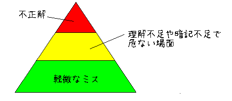 免許の更新にいったときのこと。「ヒヤリ、ハッと」の話を聞いた。1つの重大な事故の背景には29回の軽い事故があり(車をこすったりetc...)その背景には300回の「ヒヤリとする場面」や「ハッと気づく場面」があるのだ。これは正式にはハインリッヒの法則といい、保険会社の統計調査がもとになっている。テストのときのミスもこの法則に当てはまるような気がする。1つのケアレスミスの不正解の背景には29個の暗記不足や理解不足があり(結果的に自分で気づいて直す)300回の読み間違いや、書き間違い 行間でのうつし間違い、計算ミス、字が汚いなどがある。テストに当てはめると1:29:300の比は正確ではないようだが構成はきっとピラミッド上になっているはずだ。まずは300回の軽微なミスと29回の軽い事故をなくさない限りは1つの不正解を防ぐことはできない。