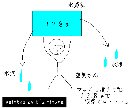 <ちょっとメモがわりに使います>マッチョ度20℃の空気さんは17.3gの水蒸気をもてます。マッチョ度15℃の空気さんは12.8gの水蒸気をもてます。マッチョ度20℃の空気さんに14.8gの水蒸気を持たせます。つぎに空気さんのマッチョ度を15℃まで下げていきます。すると持ちきれなくなった14.8g-12.8g=2.0gの水蒸気が水滴になってこぼれだしてしまいます。