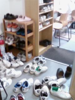 E'zのエントランスには竹園に移ってきたときに新調した靴箱がある。当時はなにも考えずに「このくらい大きかったらだいじょうぶやろ」って感じでおいたのだが・・・もうかなり満タンだ。っていうよりもあふれまくっている。となりの教室のはあんまり満タンになることはないからちょっと拝借してこようか??あと、靴はもし入らなくてもきちんと揃えましょう(怒)