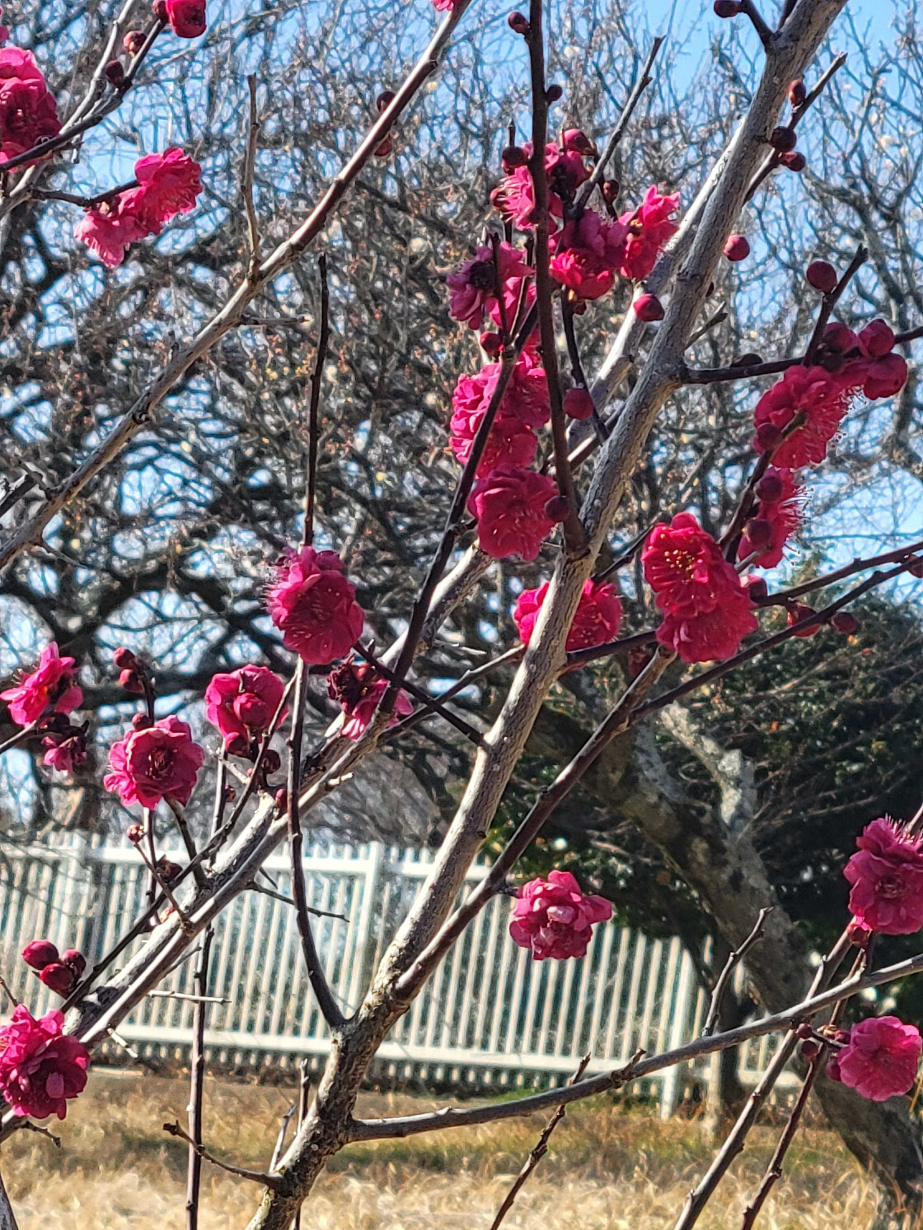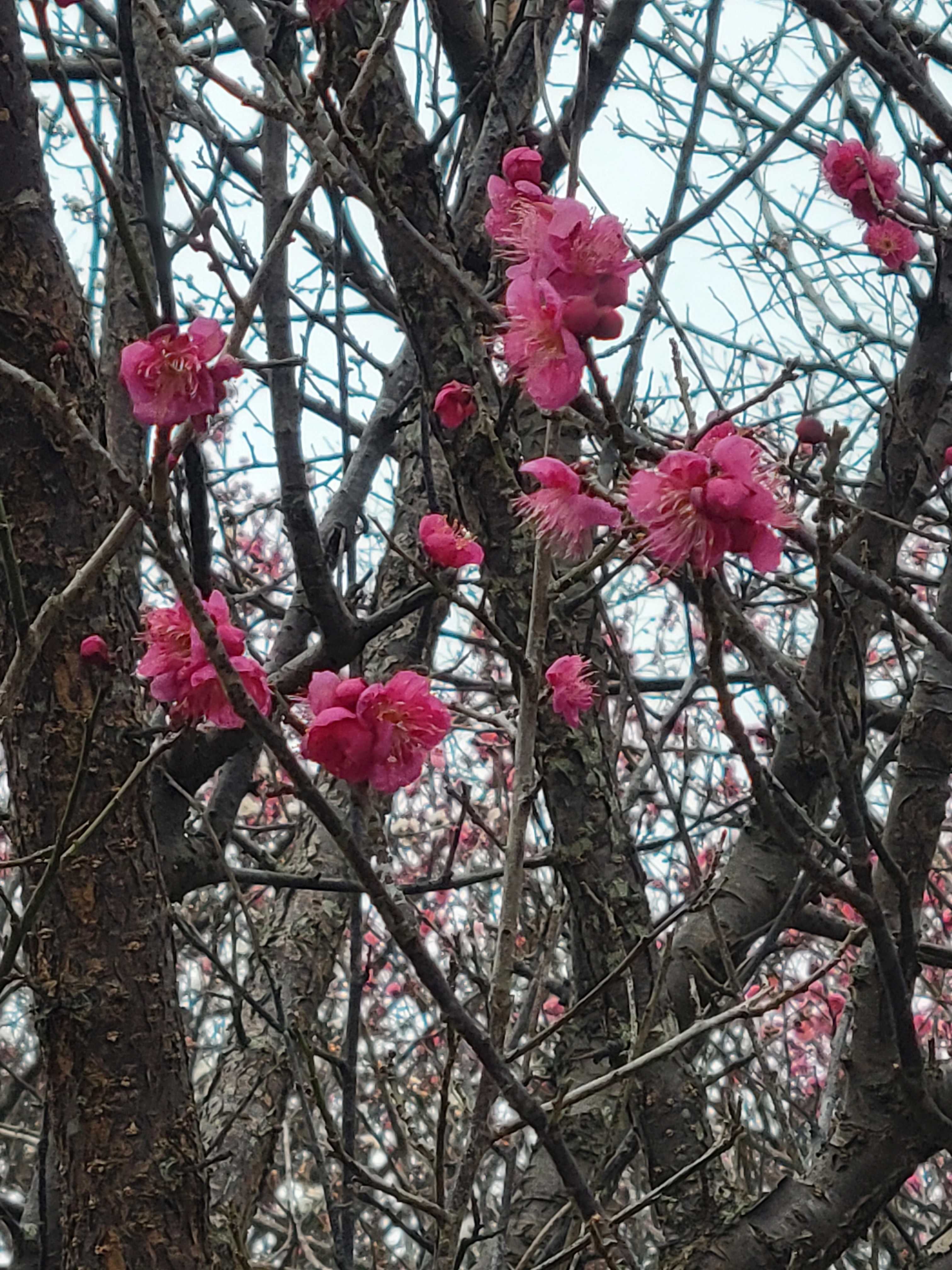 普段はランニングする主人だけど、激しすぎる運動は、尿酸値を上げるらしく、今日は、私と一緒にウォーキング。昨日の雪から一転、暖かかったし、調子よく歩けて、9km超え。いつもの公園は、今日から梅鑑賞会開催。甘酒やおでん、おしるこなども売っている。さらに、昨日の地方テレビで、この公園が紹介されたこともあってか、なんて人の多いこと。それでも、梅園を見て歩かない選択肢はなく。鹿児島紅(かごしまこう)という品種。もうこんなに咲き揃ってるのに、こんなに濃いピンクで目立つのに、どうして今まで気付かなかったのだろう。