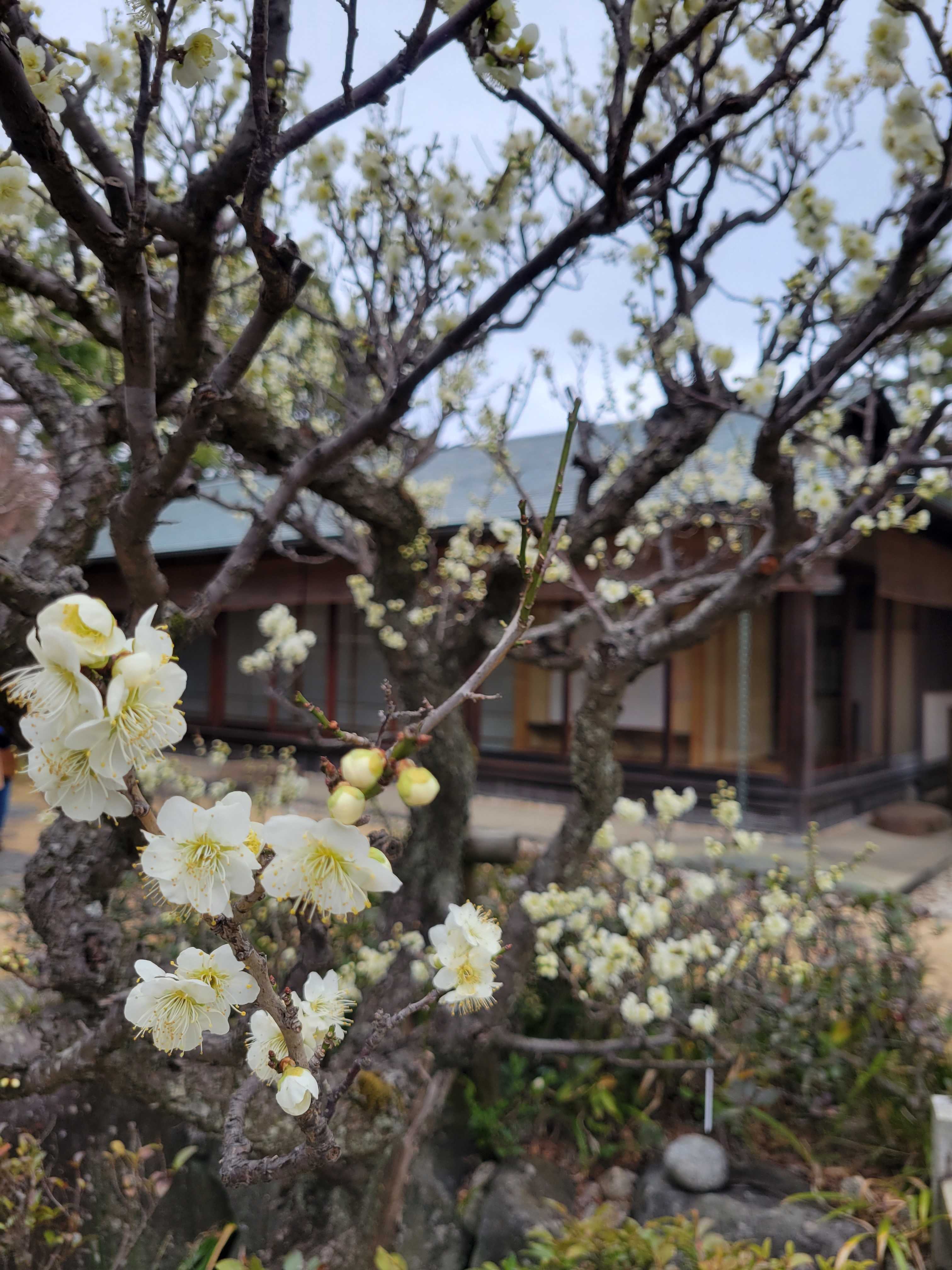 思ったより、風が強くて冷たくて、歩き始めてすぐ、引き返そうか考えた。ま、でも明日は所用で歩けないし、と、歩き続けることを選択。昨日、公式HPで見頃とupされていたので、混んでるとは思ったけど、いつもの公園の梅園へ。枝垂れ桜の類が咲き始めていて、ほとんどの木が色づいていた。珍しく入れた茶庭の梅は、緑萼梅(りょくがくばい)という品種。確かに萼の部分が緑色で、高貴な感じ。うちの庭の梅は、満開まではまだ時間がかかりそう。