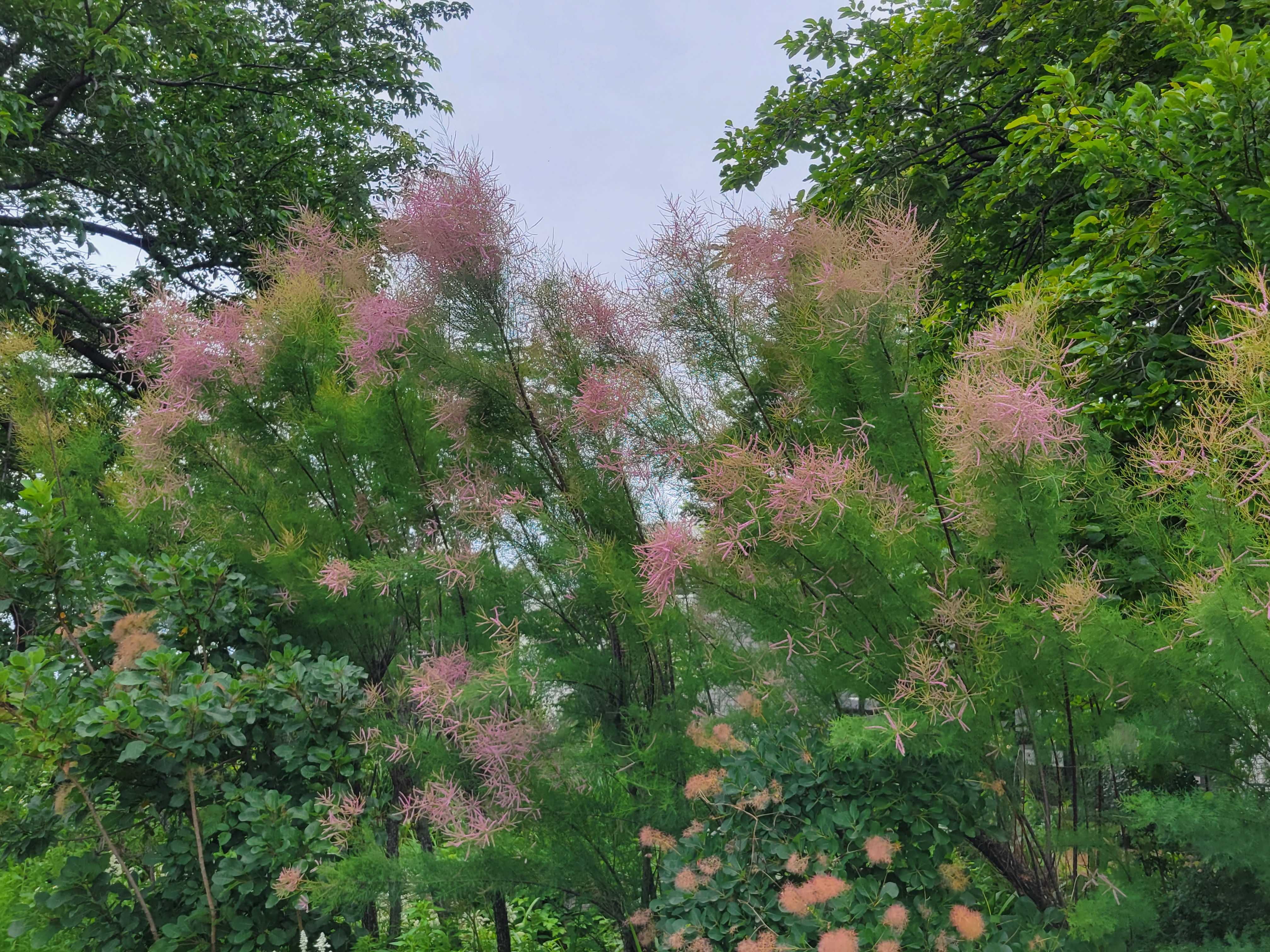 先週、ウォーキングに行った時の画像で、あげてないものがいくつかあったので。これは、ギョリュウ(御柳)。こちらは、スモークツリー。遠目に見たら、同じようなふわふわ系だけど、科とか属とか、まったく違うもの。それでも、同じような時期に、同じように咲く、というのは、なんだかおもしろい。