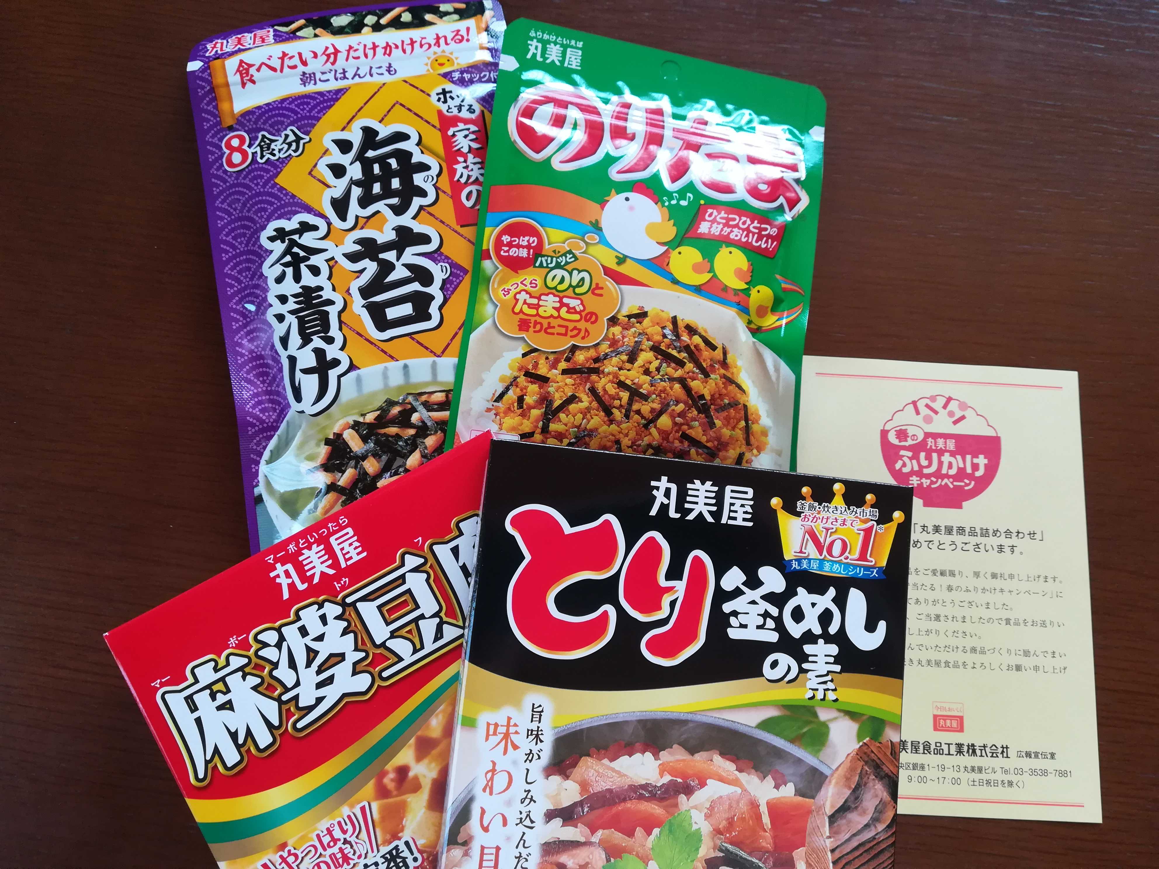 お荷物をお届けします、的なメールを受信。何もポチっていない。送り主は「キャンペーン事務局」。おおかた、懸賞にでも当たったんだろうけど、企業名などが書かれていないので、何が当たったのかもわからない。迷惑メールの可能性も考えて、日時指定などのサイトには飛ばないでおいた。そして届いたのは、丸美屋さんの詰め合わせセット。誰でも応募できるやつだったか、商品についてるマークを貼って送るやつだったか、はがきだったか、WEB応募だったか、まったく覚えてないけど、ま、いいか。懸賞なんて、そういうものの方が当たりそうな気もする。久々の懸賞の当選は、単純に嬉しい。
