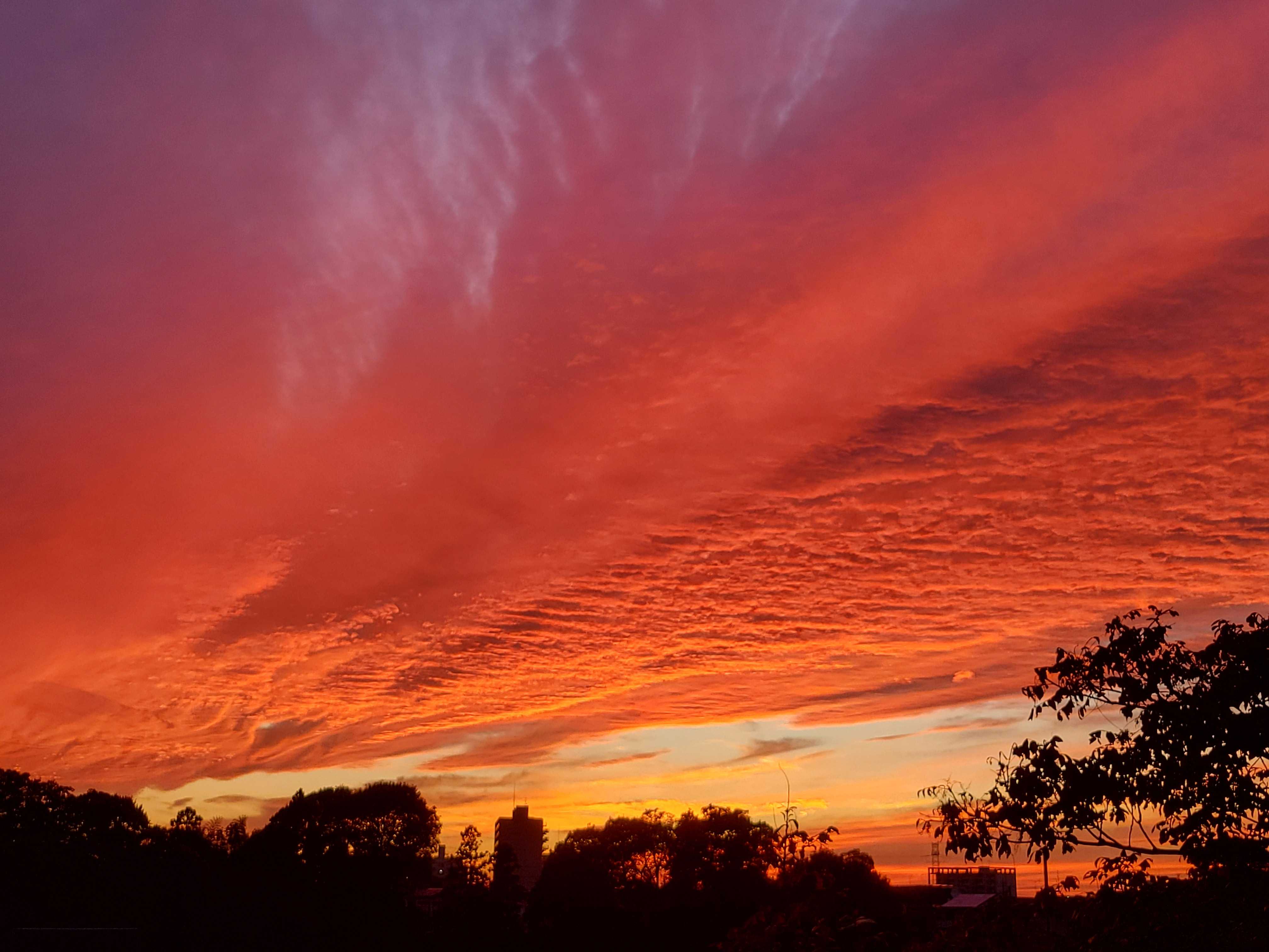 夕飯の支度をする時、まだ外が明るくても、夕飯作ってる間に暗くなるから、と、早々にカーテンをしめることが多い。支度が終わって、ひと息ついて、SNS見ると、素敵な夕焼けの写真がたくさんあがってること、多し。慌ててカーテン開けてみるも、もう外は真っ暗、というのが常。が、今日は、カーテン閉め忘れてた。みるみるうちに、部屋の中が赤くなってきて。窓の外を見たら、加工なしでこの色。すごい。これからは、リビングのカーテンだけは、暗くなるまで閉めないことにする。