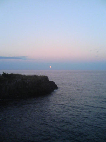 ドライブして、宿についたのは4時。夕食まで散歩することにしました。宿から、海まで徒歩で約15分ぐらい。展望台について、あたりを見渡せばそこは南西にひらけた海がまっていました。しばらくぼーっとしていると、なんか地平線に半円が見える。あれ、太陽が見える位置にしてはおかしいけど。。そうか、月だ。その半円はどんどん全貌を現し、みるみる輝いていく。しかも、今日は満月。なんてラッキーなんだろう。月は、いっきに天へと昇って行った。そして、海には月の光を反射して光の道ができていた。そのまま歩いて渡れそうなぐらい、光り輝いていた。今、ここにいられて本当に幸せ。生きていること、そしてこんな奇跡を見させてもらって、本当にありがとう。ここまでこれてよかった。感謝がこみ上げてきました。やっぱり自然は、私達が普段忘れかけていることを、呼び起こしてくれる。そんな大きな力と愛をもっているだと実感しました。