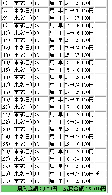 新潟1R枠連 2-3、2-4、2-5、2-6、2-8、3-4、3-5、3-6、3-8、4-5、4-6、5-8、5-6、5-8、6-83-6的中1,390円馬単 10、5、11、17、3、16、15、2、12→1、2、3、5、6、7、10、11、12、15、16、1711→5的中3,190円2R枠連 2-3、2-4、2-5、2-6、3-3、3-4、3-5、3-6、4-5、4-6、5-5、5-6、6-66-6的中450円馬単 10、9、8、2、3、5、4、7、13→2、3、4、5、7、8、9、10、11、12、1310→9的中660円3R枠連 1-3、1-7、1-8、2-3、2-7、2-8、3-7、3-8、4-8、6-7、6-8、7-7、7-87-8的中300円馬単 9、7、3、4、8、6、2、5→2、3、4、5、6、7、8、99→8的中2,250円4R枠連 1-2、1-5、1-6、1-7、1-8、5-6、5-7、5-8、6-7、6-8、7-7、7-8、8-85-7的中2,230円馬単 1、11、13、10、9、12、7、2→1、2、4、7、9、10、11、12、137→11的中7,140円5R枠連 1-3、1-4、1-5、1-6、1-7、1-8、3-4、3-5、3-6、3-7、3-8、4-5、4-6、4-7、4-8、5-6、5-7、5-8、6-7、6-8、7-84-6的中1,010円馬単 4、5、6、1、3→1、3、4、5、6、7、84→6的中1,690円京都1R枠連 1-4、1-5、1-8、2-4、2-8、3-4、3-8、4-4、4-5、4-8、5-83-4的中2,010円馬単 6、1、14、9、7、4、3、8、2、13→1、2、3、4、6、7、8、9、10、13、146→4的中3,200円2R枠連 1-4、1-5、1-6、1-7、1-8、2-4、4-5、4-6、4-7、4-8、5-5、5-6、5-7、5-8、6-7、6-8、7-82-4的中2,350円馬単 4、6、10、12、9、2、1、7→1、2、3、4、5、6、7、9、10、11、122→4的中6,310円3R枠連 1-1、1-3、1-4、1-5、1-7、1-8、3-3、3-4、3-5、3-7、3-8、4-5、4-7、4-8、5-7、5-8、7-81-3的中530円馬単 1、6、14、15、9、7、2→1、2、5、6、7、8、9、10、14、15、161→6的中1,170円4R枠連 1-3、1-4、1-5、1-6、1-7、3-4、3-5、3-6、3-7、4-5、4-6、4-7、5-5、5-6、5-7、6-7、7-71-3的中2,630円馬単 12、11、1、8、3、9、5、4、6、7→1、3、4、5、6、7、8、9、11、12、13、141→3的中5,180円5R枠連 1-2、1-3、1-5、1-6、1-7、1-8、2-3、2-5、2-6、2-7、2-8、3-5、3-6、3-7、3-8、5-6、5-7、5-8、6-7、6-8、7-8、8-81-7的中2,960円馬単 2、13、9、8、14、11、4、1、5、12→1、2、3、4、5、8、9、10、11、12、13、1411→1的中5,060円東京1R枠連 2-3、2-4、2-6、2-7、2-8、3-4、3-5、3-6、3-7、3-8、4-5、4-6、4-7、4-8、6-7、6-8、7-8、8-83-4的中700円馬単 7、6、11、15、16、14、3、13、9、4→3、4、6、7、10、11、13、14、15、167→6的中1,340円2R枠連 2-4、2-6、2-7、2-8、4-6、4-7、4-8、5-6、6-6、6-7、7-7、6-8、7-82-6的中770円馬単 9、8、11、2、3、7、10、4、5→1、2、3、4、5、7、8、9、10、11、129→2的中1,890円3R枠連 2-4、2-5、2-6、2-8、3-4、3-6、4-5、4-6、4-8、5-6、5-8、6-83-8不的中8,940円馬単 11、10、5、4、6、2、9、8→2、3、4、5、6、7、8、9、10、1111→3的中30,660円4R枠連 1-2、1-4、1-5、1-6、2-2、2-4、2-5、2-6、4-4、4-5、4-6、5-62-6的中1,780円馬単 1、3、8、6、10、4、7→1、2、3、4、6、7、8、9、10、11、12、1510→3的中6,640円5R枠連 2-4、2-5、2-6、3-4、3-5、3-6、4-5、4-6、4-8、5-6、5-8、6-8、8-88-8的中1,330円馬単 4、6、5、10、9、3、2、7、1→1、2、3、4、5、6、7、8、9、1010→9的中2,830円 今日の私は固いとは思っていたのですが、絞れず結果新潟1Rと京都1R的中するも利益490円とあまりに少ないですが、私の考え方で利益確定は終了なので明日に期待。
