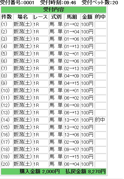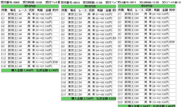 新潟1R枠連 2-5、2-6、2-7、2-8、5-6、5-7、5-8、6-7、6-8、7-82-8的中460円馬単 10、12、2、7、6、5、8、4、9→2、4、5、6、7、8、9、10、1212→2的中880円2R枠連 1-3、1-5、1-6、1-7、3-5、3-6、3-7、3-8、5-6、5-7、5-8、6-7、7-7、7-87-8的中660円馬単 14、5、10、13、11、2、18、15、8→2、3、5、8、10、11、12、13、14、15、1818→15的中19,890円3R枠連 1-2、1-4、1-7、1-8、2-3、2-4、2-7、2-8、3-7、4-7、6-7、7-87-8的中1,000円馬単 2、12、1、10、7、15、14、9、4→1、2、4、7、9、10、12、14、1515→12的中6,430円4R枠連 1-2、1-6、1-7、1-8、2-6、2-7、2-8、4-7、5-7、6-7、6-8、7-7、7-81-4不的中10,660円馬単 8、6、1、10、5、11、2、9→1、2、4、5、6、7、8、9、10、111→4的中11,030円5R枠連 2-4、2-6、2-7、2-8、4-6、4-7、4-8、6-6、6-7、6-8、7-7、7-82-6的中550円馬単 12、3、7、10、11、14、13→1、2、3、4、7、10、11、12、13、143→11的中1,650円10R 飛揚特別 (気付いた方は私のおまけです牝馬からと期待していました。)馬単 8、7、11、17、9→2、5、7、8、9、11、15、188→7的中7,430円東京1R枠連 1-2、1-4、1-5、1-6、1-8、2-4、2-5、2-6、2-8、4-5、4-6、4-8、5-6、5-8、6-6、6-84-6的中2,590円馬単 13、2、10、7、9、1、6、3、8→1、2、3、6、7、8、9、10、12、1310→6的中7,160円2R枠連 1-1、1-5、1-6、1-7、1-8、5-6、5-7、5-8、6-7、6-8、7-7、7-81-1的中720円馬単 13、1、2、16、9、11、6、14、12→1、2、6、7、8、9、11、12、13、14、162→1的中1,550円3R枠連 2-4、2-6、2-8、4-6、4-8、5-8、6-8、7-85-8的中1,100円馬単 11、2、8、4、10、1、5→1、2、4、5、6、8、10、1111→5的中1,210円4R枠連 2-3、2-4、2-6、2-7、3-4、3-6、3-7、4-6、4-7、6-73-5不的中7,070円馬単 2、9、12、3、4、6、5、11、7→1、2、3、4、5、6、7、9、10、11、126→3的中19,160円5R枠連 1-2、1-3、1-6、1-7、2-3、2-5、2-6、2-7、2-8、3-6、3-7、3-8、6-7、7-85-7不的中2,120円馬単 2、3、9、5、6、1、11、10→1、2、3、5、6、7、9、10、119→5的中2,810円11R 第47回 京王杯2歳ステークス(GII)枠連 3-4、3-5、3-7、3-8、4-5、4-7、4-8、5-7、5-8、7-7、7-83-5的中2,520円馬単 14、5、12、4、7、11、3、1、13→1、3、4、5、7、11、12、13、147→3的中27,540円京都1R枠連 1-2、1-6、1-7、1-8、2-6、2-7、2-8、6-7、6-6、6-8、7-8、8-86-6的中3,760円馬単 2、11、6、9、1、10、7→1、2、6、7、8、9、10、116→7的中6,990円2R枠連 1-2、1-3、1-5、1-7、1-8、2-3、2-5、2-7、2-8、3-5、3-7、3-8、5-7、5-8、7-8、8-83-8的中1,260円馬単 14、1、2、3、12、8、5、10、4→1、2、3、4、5、8、10、12、13、1414→3的中2,110円3R枠連 2-3、2-6、2-7、2-8、3-6、3-7、3-8、5-6、5-7、5-8、6-7、6-8、7-7、7-83-6的中13,560円馬単 13、11、15、4、7、10、6、14、9→2、4、6、7、9、10、11、13、14、156→11的中53,650円4R枠連 2-2、2-3、2-6、2-8、3-6、3-8、4-6、4-8、5-6、5-8、6-8、8-82-5不的中1,430円馬単 11、2、14、5、12、8、3、6、9→1、2、3、5、6、8、9、11、12、13、142→8的中5,650円5R枠連 2-5、3-5、3-6、3-7、3-8、5-6、5-7、5-8、6-7、6-8、7-84-5不的中520円馬単 9、6、14、13、11、18、7→3、4、6、7、8、9、11、13、14、17、189→7的中1,100円11R アンドロメダS (新潟10R不的中の場合に備えました)枠連 2-3、2-4、2-5、2-6、2-7、2-8、3-4、3-5、3-6、3-7、3-83-4的中1,480円馬単 2、3→2、3、4、5、8、9、10、11、123→5的中7,760円