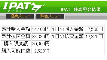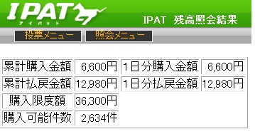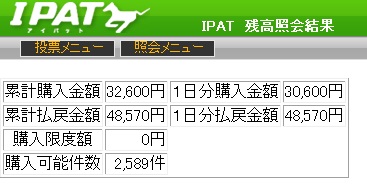 今回は1番人気2番人気と固いレースが多くWIN5でも53,509票的中で13,720円と払戻も低い数字でした。新潟1R枠連 1-3、1-4、1-6、1-7、3-4、3-6、3-7、4-6、4-7、6-7、7-71-3的中1,900円馬単 15、8、2、5、7、11→1、2、5、7、8、9、11、12、13、155→2的中4,550円2R枠連 1-2、1-3、1-5、1-6、2-3、2-5、2-6、3-4、3-5、3-6、5-61-2的中490円馬単 1、2、3、5、6→1、2、3、4、5、6、72→1的中980円3R枠連 1-2、1-3、1-4、1-6、1-7、2-3、2-4、2-6、2-7、3-3、3-4、3-6、3-7、4-6、4-7、6-74-6的中1,760円馬単 13、11、4、10、3、5、2、6、1、7→1、2、4、5、6、7、10、11、12、135→10的中7,500円4R枠連 1-3、1-6、1-7、1-8、3-6、3-7、3-8、6-7、6-8、7-8、8-81-3的中650円馬単 1、3、10、11、6、9、8→1、2、3、4、6、8、9、10、113→1的中1,210円5R枠連 1-2、1-4、1-6、1-8、2-4、2-6、2-8、4-6、4-8、6-81-8的中800円馬単 1、4、6、2、9、8、5→1、2、4、5、6、8、91→8的中2,720円11R 平ヶ岳特別枠連 2-3、2-5、2-6、2-7、2-8、3-5、3-6、3-7、5-6、6-6、6-7、6-8、7-82-7的中920円馬単 2、7、3、8、6、10、5、9→1、2、3、5、6、7、8、9、102→8的中2,310円東京1R枠連 3-5、3-6、3-7、3-8、5-6、5-7、5-8、6-7、6-8、7-8、8-83-6的中370円馬単 7、3、9、11、10、5、1→1、2、3、5、7、8、9、10、113→7的中970円2R枠連 1-2、1-3、1-6、1-8、2-3、2-6、2-8、3-6、3-8、6-8、8-83-8的中570円馬単 6、3、1、11、16、15、8、14、9、4→1、2、3、4、6、8、9、11、14、15、1616→6的中1,710円3R枠連 1-2、1-3、1-5、1-8、2-3、2-5、2-7、2-8、3-5、3-7、3-8、5-7、5-84-8不的中5,500円馬単 5、9、2、16、4、7、3、10、14、15、8→2、3、4、5、6、7、8、9、10、14、15、1616→7的中16,510円4R枠連 1-5、1-6、1-7、1-8、5-6、5-7、5-8、6-6、6-7、6-8、7-83-6不的中2,890円馬単 8、9、11、10、13、1、2、3→1、2、3、4、8、9、10、11、12、139→3的中6,930円5R枠連 1-2、1-3、1-4、1-7、1-8、2-3、2-4、2-7、2-8、3-4、3-7、3-8、4-7、4-8、7-8、8-83-7的中2,170円馬単 1、16、5、13、15、14、4、3、8、6→1、3、4、5、6、8、11、13、14、15、165→13的中11,500円8R 3歳以上500万下牝[指定] ここは大荒れ予想期待枠連 1-4、1-5、1-6、1-7、1-8、4-5、4-6、4-7、4-8、5-6、5-7、5-8、6-7、6-8、7-84-7的中3,190円馬単 6、11、9、8、12、1、4、7、3→1、2、3、4、5、6、7、8、9、11、1211→4的中6,790円10R 銀嶺ステークス枠連 1-3、1-6、2-3、2-6、3-4、3-5、3-6、3-7、3-8、6-7、6-83-6的中370円馬単 3、9→1、2、6、7、9、10、12、143→9的中490円11R 第49回 アルゼンチン共和国杯(GII)枠連 1-6、2-3、2-4、2-6、2-7、2-8、3-4、3-6、3-7、3-8、4-6、4-7、4-8、6-6、6-7、6-8、7-86-6的中1,620円12、6、11、18、4、3→1、3、4、6、7、8、11、12、13、1811→12的中3,180円京都1R枠連 2-3、2-5、2-7、2-8、3-5、3-7、3-8、5-5、5-7、5-8、7-82-3的中1,430円馬単 3、10、13、17、5、6、9、16、15、7→2、3、5、6、7、8、9、10、12、13、14、15、16、175→3的中9,960円2R枠連 1-2、1-7、2-5、2-6、2-7、2-8、5-6、5-7、5-8、6-7、6-8、7-7、7-82-7的中260円馬単 9、2、7、10、11、1、6、12→1、2、5、6、7、8、9、10、119→2的中430円3R枠連 1-6、2-6、5-6、5-7、5-8、6-7、6-8、7-7、7-86-8的中620円馬単 7、10、5、11、9、2、1→1、2、5、7、8、9、10、11、127→11的中890円4R枠連 2-3、2-4、2-5、2-7、2-8、3-4、3-5、3-7、3-8、4-5、4-7、4-8、5-7、5-8、7-84-8的中500円馬単 14、6、7、12、2、8、4、11、13→1、2、4、6、7、8、11、12、13、1414→6的中820円5R枠連 1-4、1-5、1-7、1-8、4-4、4-5、4-7、4-8、5-7、5-8、7-86-7不的中1,660円馬単 1、13、11、7、4、5、9、2、8→1、2、4、5、7、8、9、10、11、1311→9的中3,460円10R 京洛ステークス枠連 4-4、4-5、4-6、4-7、4-8、5-6、5-7、5-8、6-7、6-8、7-84-7的中400円馬単 14、7、10、8、12、6、15、16→5、6、7、8、9、10、12、14、15、1614→7的中970円11R 第2回 みやこステークス(GIII)枠連1-3、1-4、1-7、1-8、2-3、2-4、3-4、3-7、3-8、4-7、4-8、7-83-3不的中1,000円馬単 6、7、8、5、4、15、1、13、16→1、4、5、6、7、8、11、13、15、166→5的中1,380円