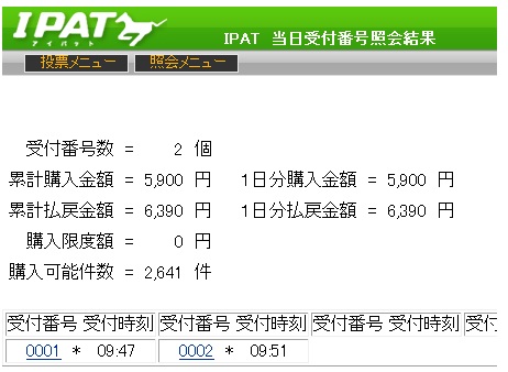 中山1R枠連 1-2、1-5、1-8、2-4、2-5、2-6、2-8、5-81-2的中440円馬単 4、16、10、2、1、15、9、11→1、2、4、6、9、10、11、15、164→2的中930円2R枠連 2-2、2-3、2-4、2-5、2-6、2-8、3-4、3-6、3-8、4-6、4-8、6-82-4的中270円馬単 8、4、7、3、5、10、11、12→3、4、5、7、8、10、11、12、168→3的中3,560円3R枠連 1-1、1-2、1-3、1-4、1-6、1-8、2-3、2-4、2-6、2-8、3-4、3-6、3-8、4-6、4-8、6-84-8的中1,390円馬単 7、1、12、11、16、3、2、4、10→1、2、3、4、7、10、11、12、167→16的中2,590円4R枠連 3-3、3-5、3-6、3-7、3-8、5-6、5-7、5-8、7-8、8-83-3的中580円馬単 3、13、4、14、12、9、7、2、6→2、3、4、6、7、8、9、12、13、143→4的中930円5R枠連 1-2、1-3、1-4、1-5、1-6、2-3、2-4、2-5、2-6、3-4、3-5、3-6、4-5、4-6、5-63-6的中440円馬単 6、11、7、9、1、4、8、12、14→1、2、4、6、7、8、9、11、12、146→11的中660円小倉1R枠連 1-2、1-4、1-7、1-8、2-4、2-7、2-8、4-7、4-8、7-8、8-81-2的中250円馬単 1、2、8、9、10、3→1、2、3、4、5、6、8、9、101→2的中480円2R枠連 2-3、2-4、2-5、2-6、3-3、3-4、3-5、3-6、4-5、4-6、5-63-6的中290円馬単 3、9、10、4、2、7、6、5→2、3、4、5、6、7、8、9、10、139→3的中890円3R枠連 1-1、1-2、1-3、1-4、1-5、1-8、2-2、2-3、2-4、2-5、2-8、3-4、3-8、4-8、5-82-4的中590円馬単 3、2、15、7、5、9、1、4、8→1、2、3、4、5、7、8、9、10、157→3的中1,140円4R枠連 1-3、1-4、1-6、1-7、3-4、3-6、3-7、3-8、6-7、6-8、7-81-3的中720円馬単 5、2、14、12、6、7、15、1、16、13、3→1、2、3、5、6、7、12、13、14、155→2的中1,710円5R枠連 1-1、1-4、1-8、4-5、4-6、4-7、4-8、5-8、6-8、7-8、8-82-5不的中2,890円馬単 9、8、4、2、1、7→1、2、4、5、7、8、95→2不的中6,800円阪神1R枠連 1-3、1-4、1-5、1-7、1-8、3-4、3-5、3-7、3-8、4-5、4-7、4-8、5-7、5-8、7-83-7的中960円馬単 6、16、10、14、7、8、1、12、5、13、2→1、2、5、6、7、8、10、12、14、1614→6的中3,190円2R枠連 1-3、1-4、1-5、1-7、1-8、3-4、3-5、3-7、3-8、4-5、4-7、4-8、5-7、5-8、7-86-7不的中570円馬単 12、7、9、5、1、14、4、13、2→1、2、4、5、7、9、12、13、1412→9的中880円3R枠連 2-3、2-4、2-6、2-8、3-4、3-5、3-6、3-8、4-5、4-6、4-8、6-82-4的中2,220円馬単 7、6、11、17、12、9、3、8、4、5→3、4、5、6、7、8、9、11、12、13、177→3的中6,230円4R枠連 2-3、3-4、3-6、3-7、3-8、4-6、4-7、4-8、6-7、6-8、7-83-8的中2,020円馬単 3、4、9、12、11、2、6、7、13、10、→2、3、4、6、7、9、10、11、12、133→12的中7,220円5R枠連 1-2、1-3、1-5、1-6、1-7、2-3、2-5、2-6、2-7、3-5、3-6、3-7、5-6、5-7、6-73-5的中950円馬単 6、11、7、2、3、8、1、9、13、4→1、2、3、4、6、7、8、9、11、137→3的中12,130円11R 第63回 阪神ジュベナイルF(GI)枠連 1-6、1-7、1-8、3-6、3-7、3-8、4-5、4-6、4-7、4-8、5-6、5-8、6-7、6-8、7-86-7的中880円馬単 18、13、16、12、8、10、15、11、5、1→1、2、5、8、10、11、12、13、15、16、1813→11的中8,270円 私の場合は阪神3Rと11R的中でした。