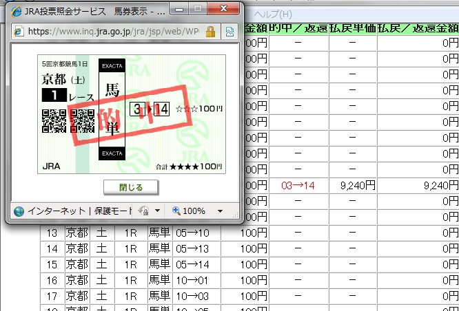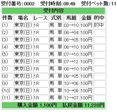 京都1R枠連 1-2、1-3、1-5、1-7、1-8、2-5、2-7、2-8、5-7、5-8、7-82-7的中3,920円馬単 1、5、3、10、13、14→1、3、5、10、11、13、14、15、163→14的中9,240円2R 返還馬番 1番 返還枠番 1枠 枠連 2-3、2-4、2-5、2-6、3-3、3-4、3-5、3-6、4-4、4-5、4-6、5-6、6-63-4的中530円馬単 4、11、10、7、5、6、14、2→1、2、3、4、5、6、7、8、10、11、145→6的中5,060円3R枠連 4-5、4-6、4-7、4-8、5-6、5-7、5-8、6-7、6-8、7-84-5的中220円馬単 4、5、2、12、10、3、8、1→1、2、3、4、5、8、9、10、11、124-5的中320円4R枠連 4-4、4-5、4-6、4-7、4-8、5-6、5-7、5-8、6-7、6-8、7-8、8-85-7的中1,210円馬単 5、7、14、11、2、10、12、6→1、2、4、5、6、7、8、10、11、12、1411→7的中6,900円5R枠連 1-3、2-3、2-6、2-7、3-6、3-7、3-8、6-6、6-7、6-8、7-82-6的中2,460円馬単 3、7、6、2、8、9→1、2、3、5、6、7、8、9、10、112→7的中10,900円東京1R枠連 1-3、1-5、1-6、1-7、3-5、3-6、3-7、5-6、5-7、6-73-6的中540円馬単 3、11、9、1、7、2、10→1、2、3、4、5、7、8、9、10、118→3不的中34,090円2R枠連 1-3、1-5、1-6、1-7、3-5、3-6、3-7、5-6、5-7、6-73-5的中330円馬単 3、10、5、7、6、1、9、11→1、2、3、5、6、7、8、9、10、115→3的中2,070円3R枠連 1-2、1-4、1-5、1-8、2-4、2-5、2-8、4-5、4-8、5-85-8的中130円馬単 5、8、2、1、9、4→1、2、4、5、6、7、8、95→8的中190円4R枠連 1-2、1-5、1-8、2-2、2-4、2-5、2-7、2-8、4-5、4-7、4-8、5-7、5-8、7-8、8-87-8的中930円馬単 2、3、8、14、1、15、5、6、12→1、2、3、5、6、7、8、9、12、14、1515→13不的中16,580円5R枠連 1-7、2-4、2-7、2-8、3-4、3-7、3-8、4-7、4-8、7-7、7-83-4的中3,080円馬単 13、7、14、3、17、6、1、8→1、3、5、6、7、8、9、12、13、14、16、175→8不的中80,390円 今日の私は仕事の為早朝に仕掛けていました。 結果1R、2R的中8,900円の利益確定でした。