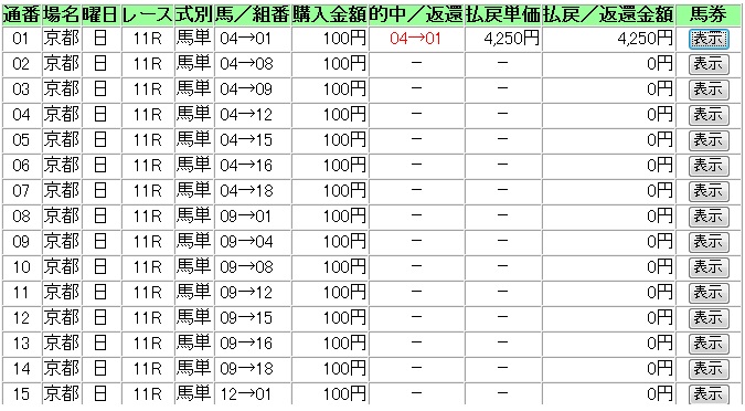中山1R枠連 2-5、2-6、2-7、2-8、5-6、5-7、5-8、6-7、6-8、7-8、8-83-6不的中1,000円馬単 11、3、16、9、6、15、13→3、4、6、9、11、13、15、166→11的中3,750円2R枠連 1-1、1-2、1-3、1-6、1-8、2-3、2-6、2-8、3-6、3-8、6-87-8不的中1,010円馬単 2、16、14、3、12、15、6、13、1→1、2、3、6、7、11、12、13、14、1616→13的中6,540円3R枠連 1-2、1-5、1-7、1-8、2-5、2-7、2-8、5-5、5-7、5-8、7-82-5的中690円馬単 17、9、14、4、2、10、1、13、12→1、2、4、7、8、9、10、12、13、14、179→4的中1,700円4R枠連 1-3、1-4、1-5、1-7、1-8、3-4、3-5、3-6、3-7、4-5、4-6、4-7、5-72-6不的中12,440円馬単 1、8、13、9、6、10、7、11、5、4→1、4、5、6、7、8、9、10、11、13、1511→3不的中232,840円5R枠連 2-2、2-3、2-4、2-6、2-8、3-4、3-6、3-8、4-6、4-8、6-82-6的中360円馬単 4、8、12、5、16、3、1、2、13、6、10→1、2、3、4、5、8、10、12、13、164→12的中600円10R 仲冬ステークス枠連 2-3、2-5、2-6、2-7、3-5、3-6、3-7、5-6、5-7、6-7、6-8、7-7、7-82-7的中1,170円馬単 13、3、12、14、10、5、15、16、11→1、2、3、4、5、10、11、12、13、14、153→14的中5,290円11R 第63回 朝日フューチュリティ(GI)枠連 1-2、1-4、1-6、1-8、2-2、2-4、2-6、2-7、2-8、4-6、4-7、4-8、6-7、6-8、8-82-2的中1,660円馬単 3、7、16、2、15、4、1、8、12、13、6→1、2、3、4、6、7、8、12、13、15、163→4的中2,180円小倉1R枠連 1-2、1-3、1-5、1-6、1-8、2-3、2-5、2-6、2-8、3-5、3-6、3-81-2的中370円馬単 2、4、16、5、10、6、1、7→1、2、4、5、6、7、10、12、164→2的中1,940円2R枠連 4-5、4-7、4-8、5-5、5-7、5-8、7-87-8的中340円馬単 14、12、6、8、7、11、10、13→1、4、5、6、7、8、9、10、12、13、1414→11的中1,930円3R枠連 1-2、1-5、1-6、2-5、2-6、2-7、2-8、5-6、5-7、5-8、6-81-7不的中3,460円馬単 10、3、11、16、9、2、14、15、7→2、3、7、9、10、11、14、15、16、1814→2的中12,720円4R枠連 2-3、2-4、2-5、2-6、2-7、3-4、3-5、3-6、3-7、4-5、4-6、4-7、5-5、5-6、5-7、6-76-8不的中2,700円馬単 3、9、8、13、15、6、10、5、11、12→3、5、6、8、9、10、11、12、13、1515→12的中18,510円5R枠連 1-1、1-2、1-3、1-4、1-6、1-7、2-3、2-4、2-6、2-7、3-4、3-6、3-7、6-7、6-8、7-83-7的中1,710円馬単 1、6、12、7、2、3、14、16、13、11、4→1、2、3、4、6、7、10、12、13、14、1613→6的中9,930円11R 第49回 愛知杯(GIII)枠連 1-5、1-6、1-7、2-5、2-6、2-7、4-5、4-6、4-7、5-6、5-7、6-7、6-8、7-82-6的中2,630円馬単 13、10、12、15、2、8、3、16、4→2、3、4、7、8、10、11、12、13、1512→4的中14,470円阪神1R枠連 2-3、2-4、2-5、2-6、3-4、3-5、3-6、4-5、4-6、4-7、5-6、6-6、6-73-6的中600円馬単 4、7、8、3、5、9、2、11→1、2、3、4、5、7、8、9、113→7的中1,940円2R枠連 1-6、3-5、3-6、3-7、3-8、5-6、5-7、6-7、6-85-6的中510円馬単 11、16、9、6、10、12→2、5、6、9、10、11、12、14、15、1611→9的中800円3R枠連 1-8、3-4、3-5、3-7、3-8、4-5、4-7、4-8、5-7、5-8、7-8、8-84-8的中840円馬単 15、16、10、14、5、7→2、4、5、6、7、10、11、14、15、167→15的中3,920円4R枠連 1-3、1-5、1-6、1-7、3-3、3-4、3-5、3-6、3-7、4-5、4-7、5-6、5-7、6-77-8不的中1,090円馬単 4、12、9、7、1、5、3、2、13→1、2、3、4、5、7、9、12、1312→13的中2,600円5R枠連 1-3、1-4、1-5、1-8、3-3、3-4、3-5、3-8、4-5、4-8、5-5、5-84-5的中820円馬単 8、10、6、1、16、5、9、4、13→1、2、3、4、5、6、8、9、10、13、14、168→10的中1,470円11R ギャラクシーS枠連 1-3、1-4、1-6、1-7、1-8、3-4、3-6、3-7、4-6、4-7、6-7、7-72-2不的中32,160円馬単 1、6、12、10、4、13、14、2、8、3→1、2、3、4、6、8、10、12、13、142→3不的中82,870円