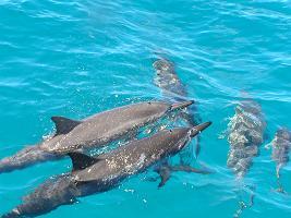 今日はダイビングをお休みしてイルカウォッチングに参加。乗船客には日本人も外国人と色々だが、定員20人の少人数の船を選んだ。ウエストショアーのコオリナ湾から船でイルカの居そうな場所に行く。適当に停泊して広い海にイルカがいないか参加者全員で目を皿にして探す。以外にもプロの船員ではなく乗船客の1人(日本人)が遠い所で見つける。すぐに船を走らせイルカへ目指す。他のウォッチング船が観てるのを発見!!邪魔をしないように、彼らが船に上がってから海でスノーケリング。しかし、フィンはつけない。今のシーズン出産時期の為、神経質になっているのとバシャバシャ追いかけてストレスを与えないよう、イルカが来るのをじっと待つ。するといきなり私の真下に!!他の乗船客が周りに居なかったのでナイスショットが撮れた。(自己満足)子供イルカがお母さんに寄り添って可愛い。もうそれだけで感動なのに、またやって来てくれた。 約20匹くらい。話によると今日はラッキーらしく、観れない事や、観てもすぐに居なくなるらしい。やっぱり日頃の行いかしらん。その後、ウミガメポイントでスノーケリング。ここでも海ガメが甲羅を魚にお掃除してもらってたので動かないからラッキー!全部で5匹もいました。大満足の1日。