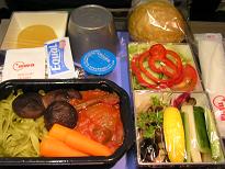 飛行機が22:30PM出発で夜遅い食事、帰りは現地での食事が野菜不足になるだろう、と思って往復『ベジタリアンミール』を指定。「ベジタリアンミール」には乳製品を使用可 と 乳製品使用不可 の2種類がある。乳製品未使用のは徹底したベジタリアン向けなんでしょう。乳製品未使用だとあまりにも味気ない気がしたので、私は使用したものをチョイス。<行きの食事> 意外にもパスタとか入ってて美味しそうでしょっ!指定してない人達より早く配ってくれるし、内容も断然良かった。<帰りの食事> 到着前の軽い食事は、ウサギ?って感じの内容。人参は生だし・・・でもデザートのブラウニーは美味しかった個人旅行だからか行きの飛行機でGODIVAのチョコレート引換券をいただく。もちろん、しっかり受取りに行きましたよ