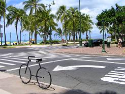 オアフ島市内の至る所で目にする自転車の形のモニュメント最初はここのお店で自転車をレンタル出来ますって云う看板代わりだと思ってたら、実は自転車を停めておく為のものだった。これだと通行の邪魔にならず、見た目もすっきり、可愛くっていいですね。ただ、自転車の利用者が多い中国や日本には不向きかな。