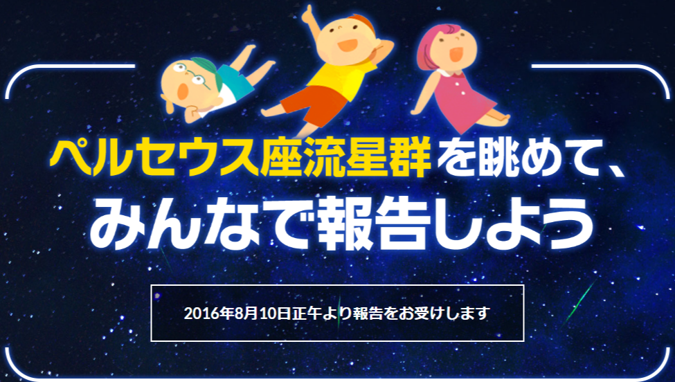 夏の流星群の代表【ペルセウス座流星群】の季節がやってきました。2016年のペルセウス座流星群はたいへんよい条件で観察ができます。8/11が上弦の月のため、月は夜半頃沈みます。それ以降は月明かりの影響がなくなり、暗い流星まで見ることができるためです。1極大:8/12 22時頃11時間に45個程度。(2016年は普段の年よりも活動が活発という予想もあるようです。)8/10(水)~8/15(月)時期的にはお盆の時期で、子供達の夏休みに加え、大人の方は仕事がお休みの方も多いのではと思われます。お盆行事にご家族で観測会もいいですね。防虫対策も忘れずに!!