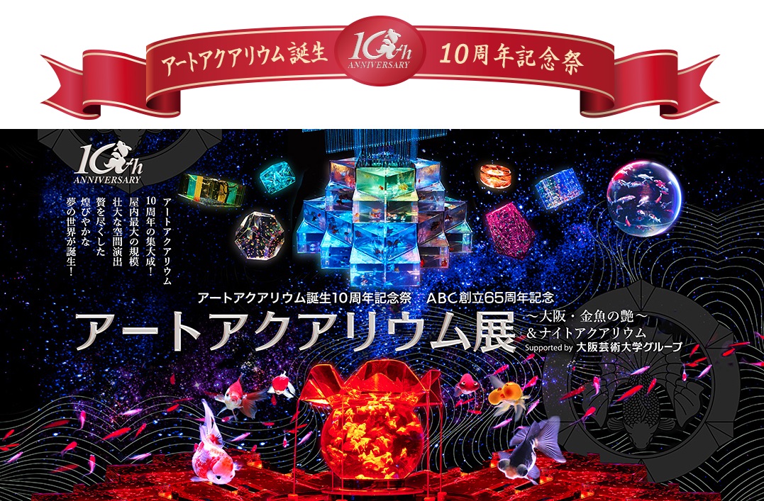 『アートアクアリウム誕生 10周年記念祭』アートアクアリウム展 ~大阪・金魚の艶~ &ナイトアクアリウムに行ってきました。[水中アートのパイオニアが贈る アートアクアリウム史上最大規模の展覧会]と謳っているが、個人的には前々回に大阪で開催されたものの方が良かったように感じる。イベント会場も以前に比べて狭くなったし、映像もなかったし・・・。とはいえ、それなりに堪能。個人が特定できないよう、一部画像編集させていただいております。上のが下にも映っていて綺麗。これなどはいたってノーマルな感じで納涼さを感じます。金魚の万華鏡奥には大きなひな壇があり、横にはランタンがあって、その大きさが華やかを醸し出しています。皆がひな壇の横で座って観賞しているので、全体像は撮れず。写真は雛段を上がった横からです。 この大きな水槽は花魁かな?大奥かな??アクアリストである木村英智氏は金魚とガラスで「花街(かがい)」を表現しています。映画「ファインディング・ドリー」にちなんででしょう。ニモとドリーが表と中でも観賞できます。これなら子供にも親しみをもってもらえますね。金魚は、先日大和郡山の金魚資料館へ行ったばかりなので「どうしたの?その眼」っていうような金魚(水泡眼)やらんちゅう、頂天眼など見た物ばかりで、その一匹当たりの料金までも頭に浮かんでしまうという有様。何でも裏側を知ってしまうのは良くないですね。(^-^;堪能しました。