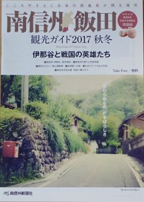天竜川下りを堪能した後は、宿でいただいた観光ガイド「南信州飯田観光ガイド2017秋冬-伊那谷と戦国の英雄たち-」 南信州新聞社が発行しているだけあって内容が濃い。しかも無料。今回の特集は歴女にはたまらない一冊となっている。その中で戦国武将とは関係のない写真に惚れて、その場所に行ってみました。【下伊那教育会館】登録有形文化財 第20-0451~0454号 飯田城下の武家地にあたる仲ノ町にあります。 4つも登録されているので、建物以外の内部3ヶ所なのでしょう。残念ながら日曜日は休館で中に入れませんでしたが、玄関から中を覗き見。 昭和レトロな感じです。教育会館前の土蔵と柿のコラボが何となくいいなぁ~と思って逆光ですが写真を撮りました。 これと似た土蔵が教育会館前のもう少し奥に「下伊那教育会旧黒須家土蔵」があり登録有形文化財だったみたい。blogを書いてて知りました。すぐ目の前なのに工事中で前を通れなかったのもあり、見逃してしまい残念。この他にもblogを書いてて知ったのですが、周りに色々と登録有形文化財 建造物が何ヶ所かあったようで・・・。また次があればですね。飯田市のマンホールがリンゴの絵になってて可愛いです。 次に伺ったのは【雲龍山 松源禅寺】 なぜここかというと、先に紹介した観光ガイドに鐘楼が載っていてこの時季ならではの風物詩があったからなんです。 下から見上げてみます。「市田柿の柿すだれ」だそうで、これは本当に見事。 普段見慣れないものだけに、ちょっと感動。この寺の前に「史蹟 松岡城阯」があり、そこから見る山の景色も感動。 南アルプスの雪山と麓の紅葉。この時期は2つの季節を同時に感じられるのですね。寒いですが景色は最高に素敵です。移動中に見つけたレトロな建物のレストラン 大正12年に建てられた建物のようです。正面から見たかったが撮れなかった・・・(^-^長野県を後にし、愛知県へ移動します。