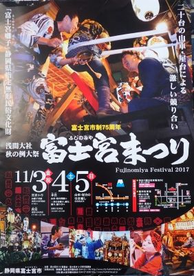 11月の3連休は3日が文化の日という事もあり、関西に居る事は普段は公開されていない所が一般に特別公開される文化財が多かったのですが、静岡ではそういうイベントを耳にしない。その分、富士宮では「まつり」をする場所も多いようです。『富士宮まつり』山車・屋台の競い合い。(富士宮浅間大社)『森のまつり』通称「けんか祭り」。勇壮に屋台が激しく練り歩く。(三島神社)その中で富士宮本宮浅間大社のお祭り【富士宮まつり】に行ってきました。 2日目の夕方から始まる【本宮】を狙って行ってみました。山車や屋台が一堂に集まるので、めっちゃ凄い人混みを覚悟して行ったのだが、それ程でもなくお正月より空いてるように思うのは気のせいか・・・ 女子も横に乗ってて格好良い落ちないように固定してはいるが周る時は危ないですからね。それぞれの山車には木彫りの彫刻がついてて、お金かかってそうです。 お祓いのあと、神様に玉串を捧げる行事が執り行われる。 そして富士宮市長のご挨拶。後には「ミス富士山」2名もいらっしゃいますよ。 この後、神様に一斉に「富士宮囃子(静岡県無形文化財指定)」を奉納です。何か皆が集まってきてるから私も~って思い、行ってみたら なぜか一番前のベストポジションに位置している自分に笑けた。(笑) 富士宮市民でもないのに・・・しかし、このお陰で文化祭のような地元のお祭りではなく、神様に捧げる本来のお祭りに神聖な気持ちで参加できた気がしました。【富士宮まつり】は、平安時代の文人 都良香(みやこノよしか)が『富士山記』で「貞観17年(875)11月初申の日に吏民旧によりて祭を行う」と記した富士宮本宮浅間大社では記録に残る最も古い祭りです。富士山の湧水で生活し、また農業・産業を営む岳麓一帯の人々が、稔りの秋に浅間大神に感謝の誠をささげるのが浅間大社の例祭です。 本宮(ほんみや) 11月4日午後4時~富士宮市内の山車・屋台が神田通に勢ぞろいし、一斉に囃子を奉納する行事です。通常山車や屋台は時間を決めて市内を回っており、一堂に会するのはこの時だけです。お囃子、1000人奉納 富士宮まつり開幕(2017/11/4 @S 静岡新聞 SBS)http://www.at-s.com/news/article/local/east/423304.html激しい競り合い、観客魅了 富士宮まつり「本宮」(2017/11/5 @S 静岡新聞 SBS)http://www.at-s.com/news/article/local/east/423560.htmlせっかくなので大社もお詣り。富士山は雲で隠れています。 本殿はめっちゃ空いています。 普段はない舞台も設置されていた。 お正月時はめっちゃ混んでる「水屋神社」も人が居ない。 飲用される場合は煮沸してから。と提示されているが飲みました。めっちゃ美味しい。湧水池も静かで、鴨ものんびりお食事タイム。お尻が可愛い。 静かでいいなぁ~。 夕暮れに近づくと山車も一部ライトアップ。夜仕様に変わるのですね。 ちなみに、各山車の上の人形は、出したり引っ込めたり出来るようです。お囃子もおわり、催しも踊りに変わっている。 男性5人衆は、めっちゃ離れた場所で踊っているので周りに人が少ないが楽しそうで 逆にいい感じ。しかも上手いし夜には山車や屋台の競り合いもあったようです。激しい競り合い、観客魅了 富士宮まつり「本宮」(2017/11/5 @S 静岡新聞 SBS)http://www.at-s.com/news/article/local/east/423560.html雲で隠れていた富士山が、顔を出し始めていました。(ビルの間から。) 夕陽に照らされ、赤く染まっています。「富士宮まつり」めっちゃ堪能しました。また来年も行こうかな。何より、大阪の今宮神社の混みようを想像していただけに、ほど良い混み具合が良かった。