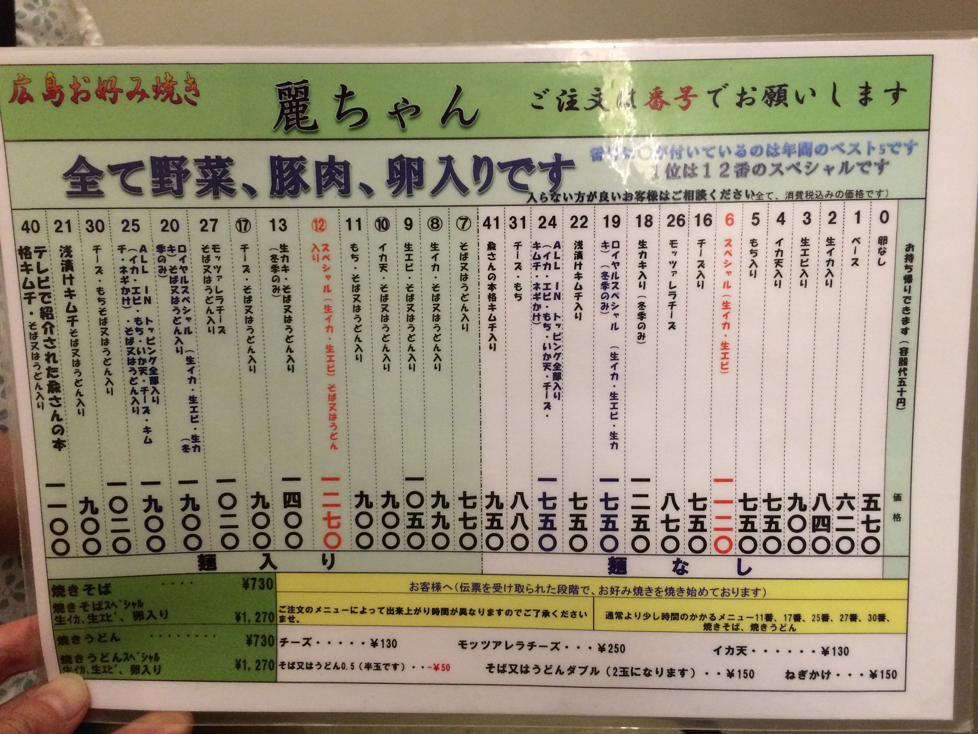 広島駅到着後、昭和32年創業の広島焼きの老舗「麗ちゃん」へ。