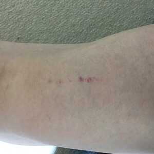 ふと思った。 薬のことは薬剤師さんだ! 健康診断のときにのバリウム問題は、お薬のところで聞けばよかった!次回覚えておこう。 困ったことはないですが質問には、次は予防接種のことも聞いとかないと。もう打ったけど。 膝上あたり。妙な形の内出血があった。4センチほど点々が繋がっている。 よくわからないけど、とりあえず撮影。