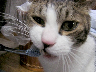 猫のはみがきです。はぶらしを、つかいます。ほらね。上の歯の裏もできるよ・・・。僕は、歯ブラシで、歯磨きします!・・・・・・・。・・・・・・・・。・・・・・・。違います。本当は、ブラシのかわり。背中やおなかは大きなつやだしブラシを使うけど、顔の周りや、ヒゲが生えてる辺りなんかは、ブラシを使いにくい。でも、この辺も、痒くなるときがあるんだよね。そんな場所は、ヒト用のはぶらしがぴったり。鼻筋なんかも、はぶらしでこちょこちょしてもらっている。みんなも、どう?・・・・・。ただ、途中でじゃれ付いちゃうんだ・・・。【ちょっと試してもらおう・・と思う猫はポチッとね→ 人気blogランキング】
